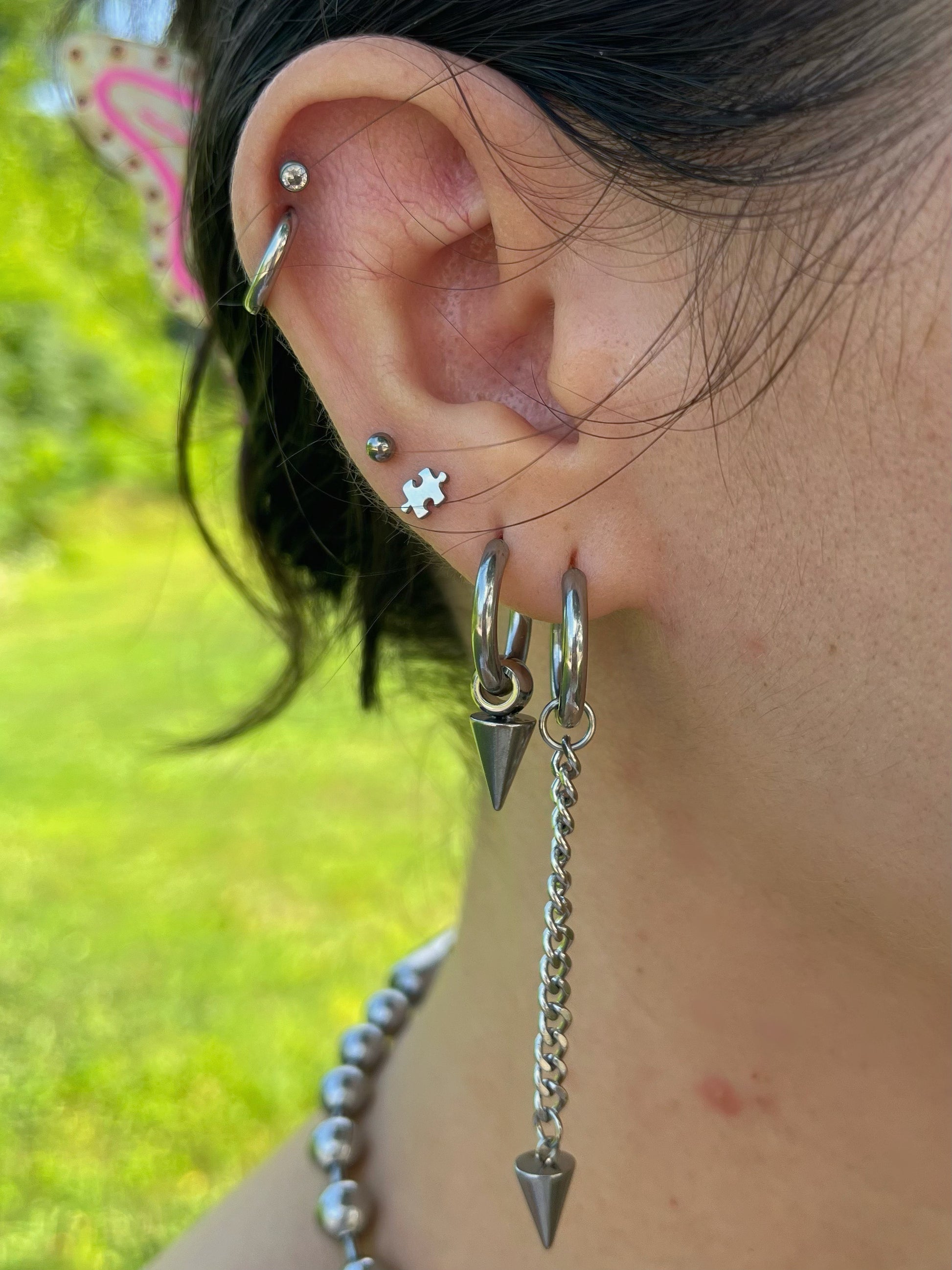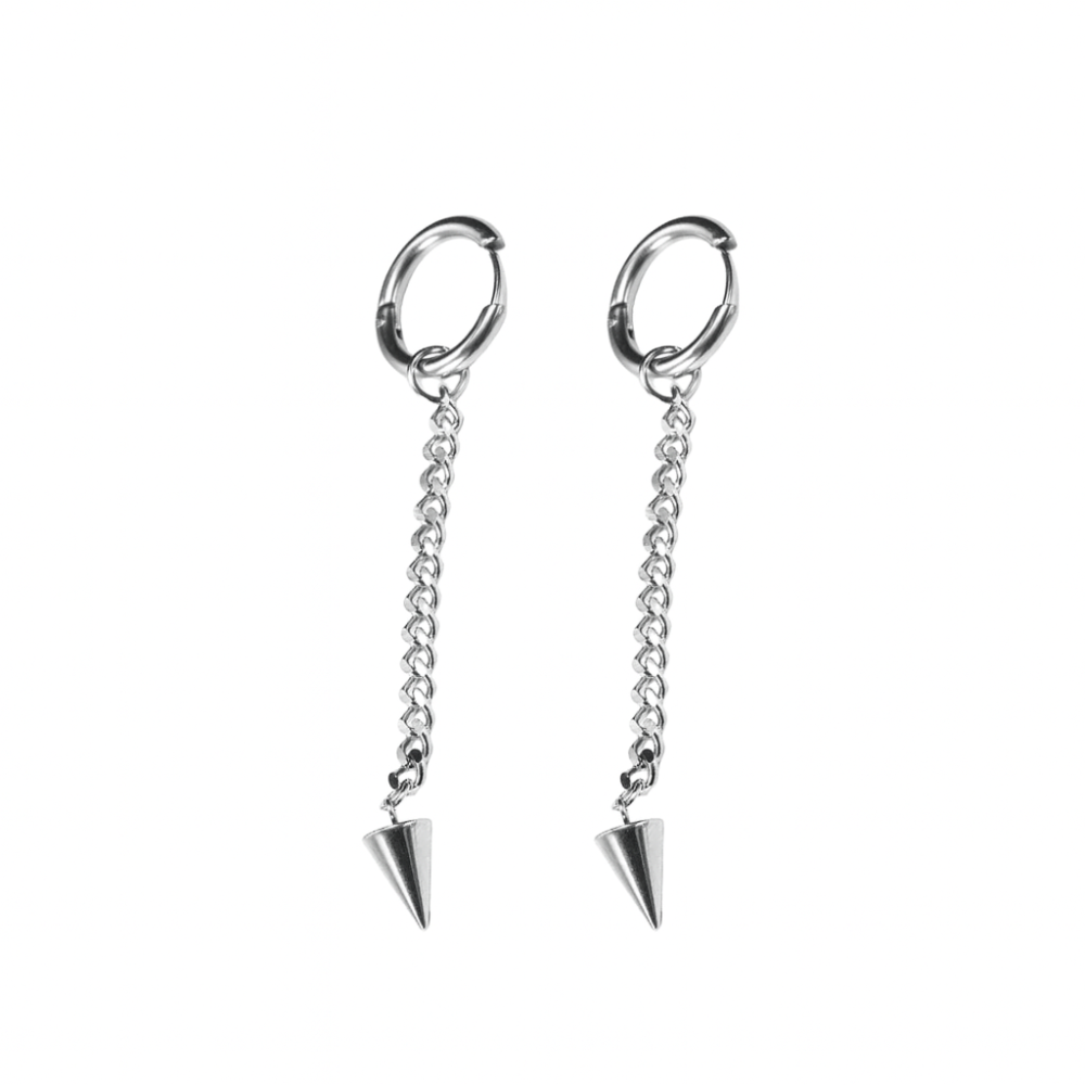 Long Chain with Spike Dangling Huggie Hoop Earrings - Pair - Stainless Steel