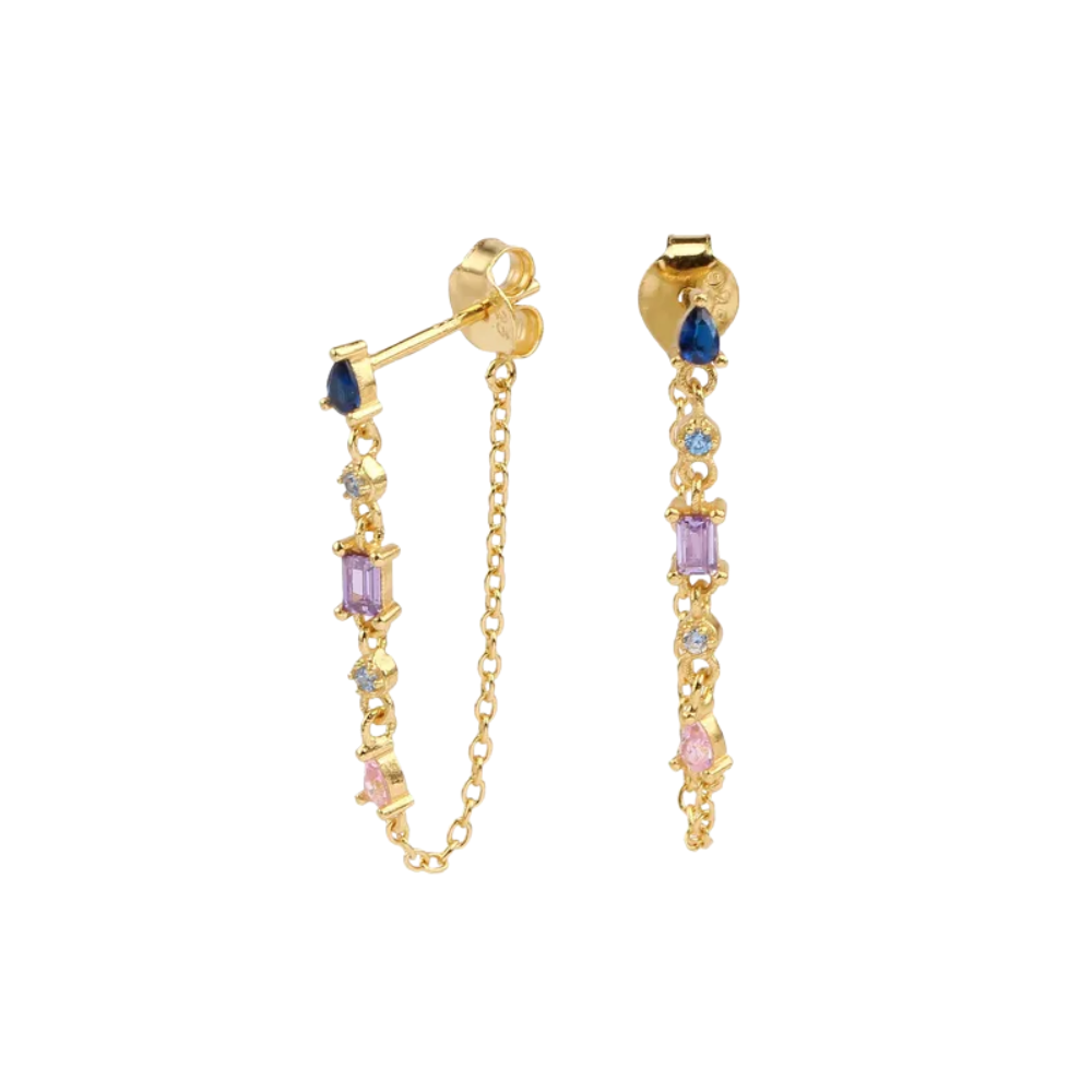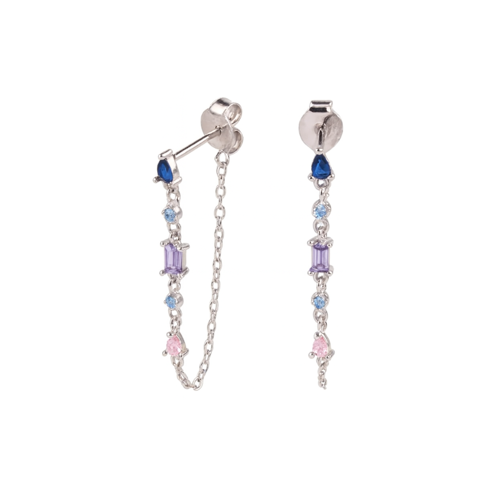 Pink Purple and Blue Crystal Stud Earrings with Connecting Chain - 925 Sterling Silver