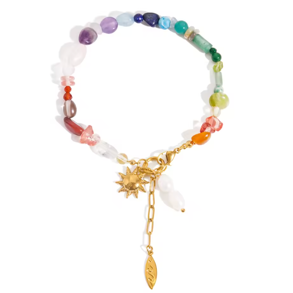 Rainbow Beaded Bracelet with Dangling Sun and Synthetic Pearl Charms - Gold Plated Stainless Steel
