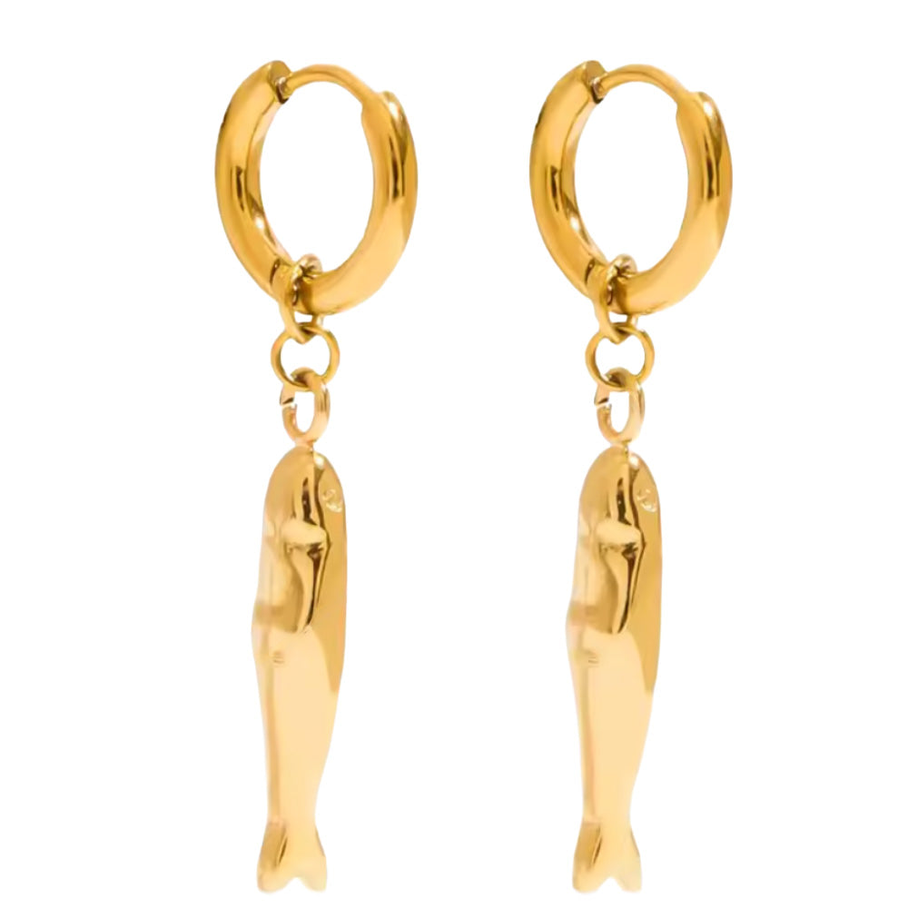 Sardine Fish Dangling Huggie Hoop Earrings - Pair - 18K Gold Plated Stainless Steel