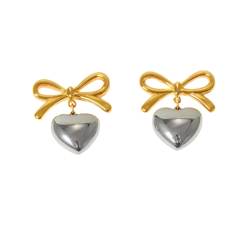 Two Tone Bow with Dangling Heart Earrings - Pair - Stainless Steel