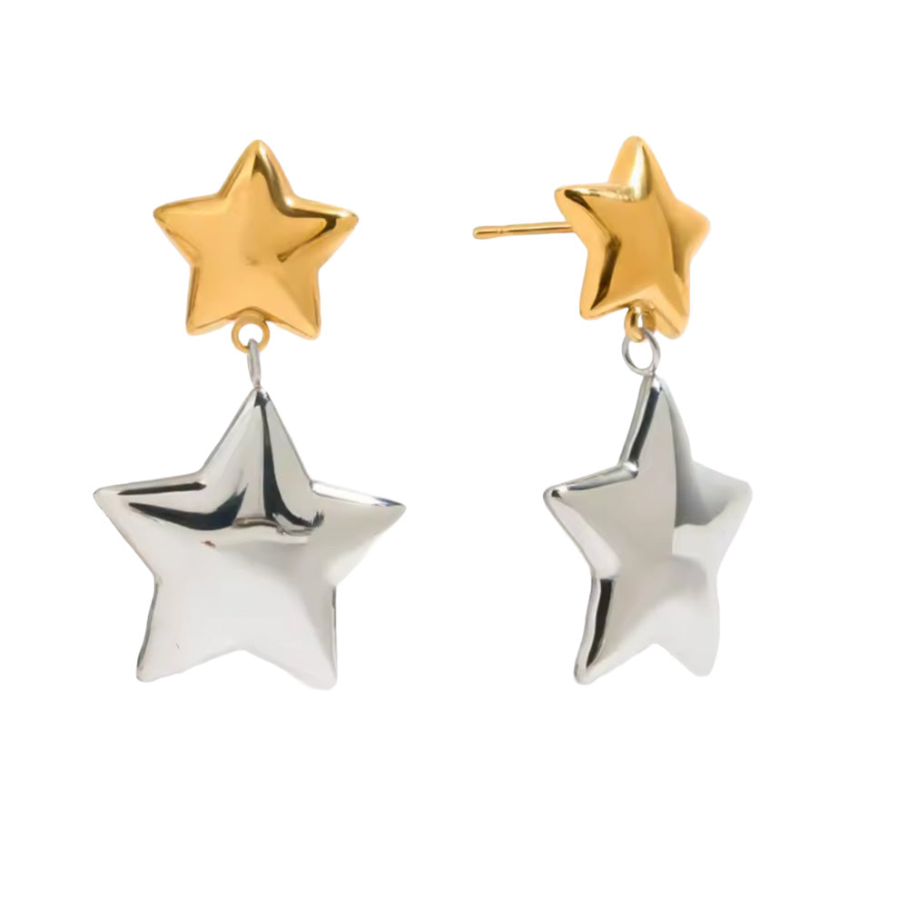 Two Tone Double Star Dangling Earrings - Pair - Stainless Steel