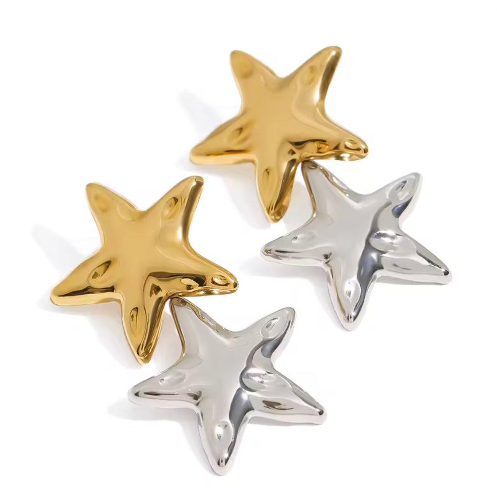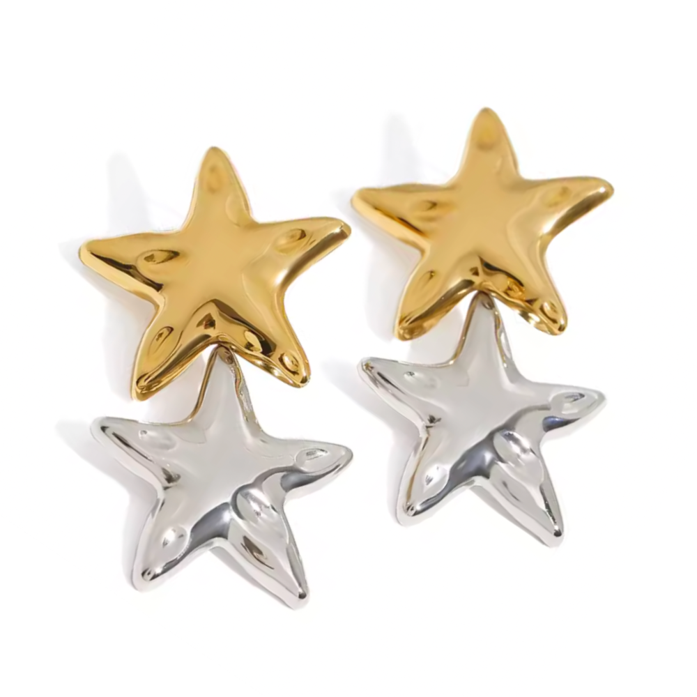 Two Tone Large Double Star Dangling Earrings - Pair - Stainless Steel