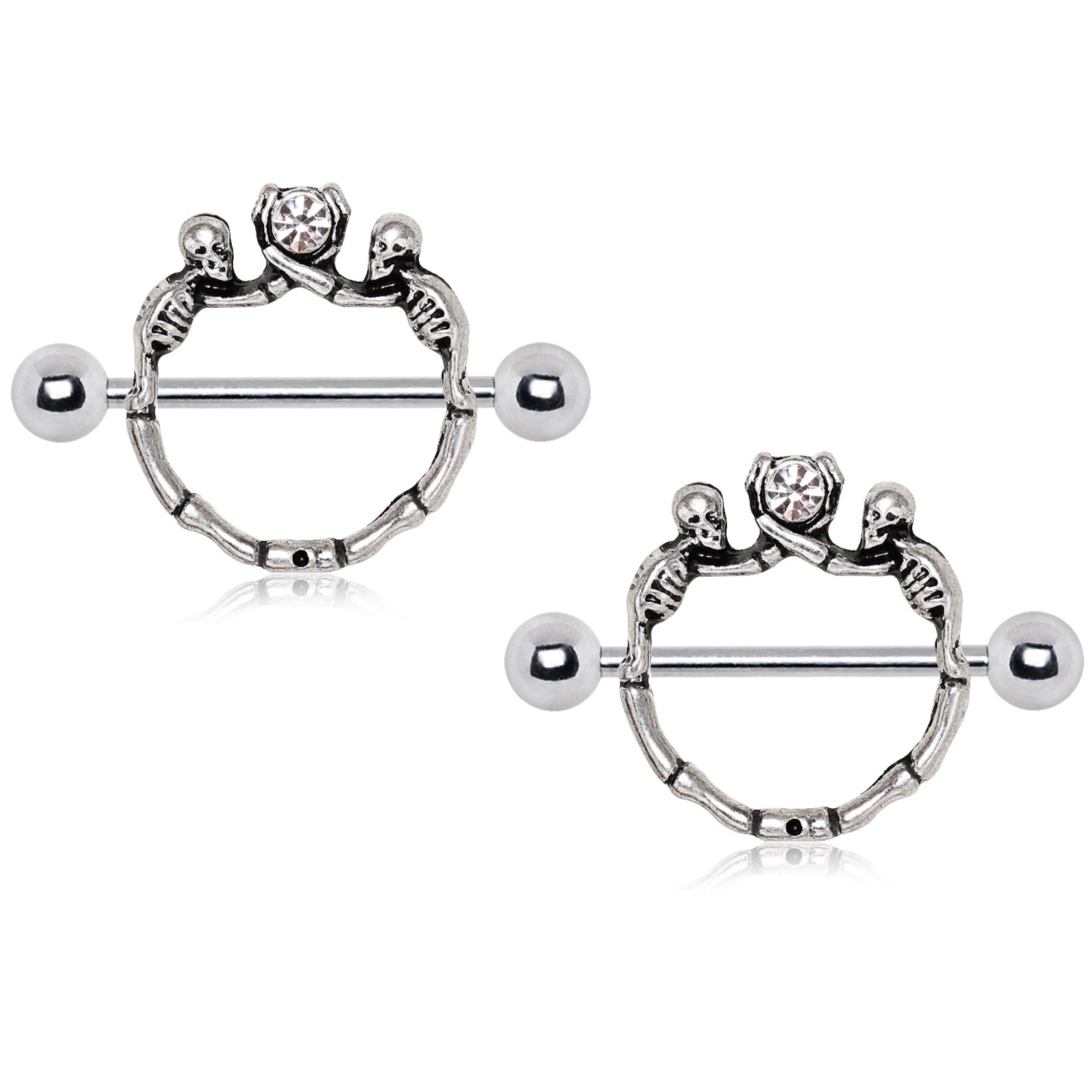 Double Skeletons Holding Up CZ Barbell Nipple Ring Shields - 316L Stainless Steel - Pair