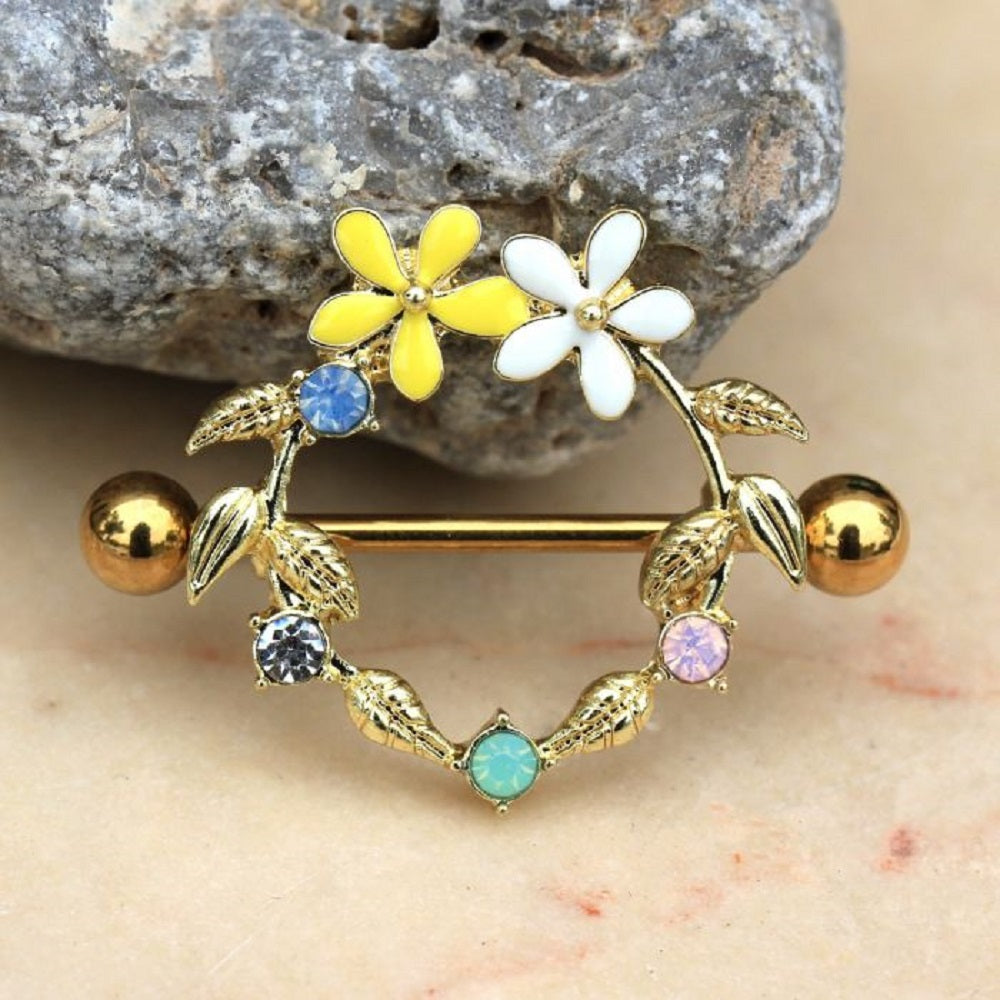 Golden Leaves Shield with Flowers and Colorful CZs Barbell Nipple Ring Shields - 316L Stainless Steel - Pair