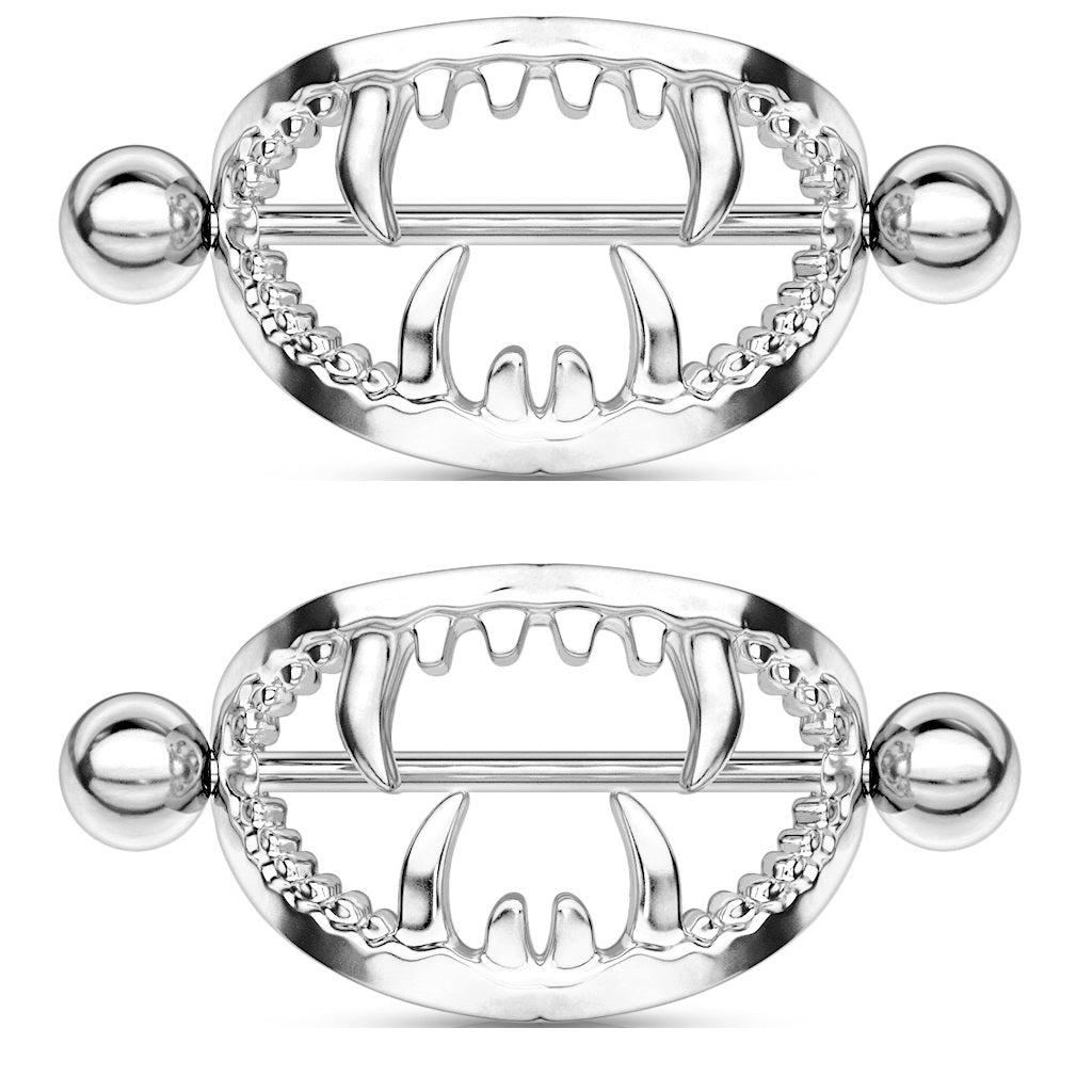Gothic Fangs Barbell Nipple Shields - Stainless Steel - Pair