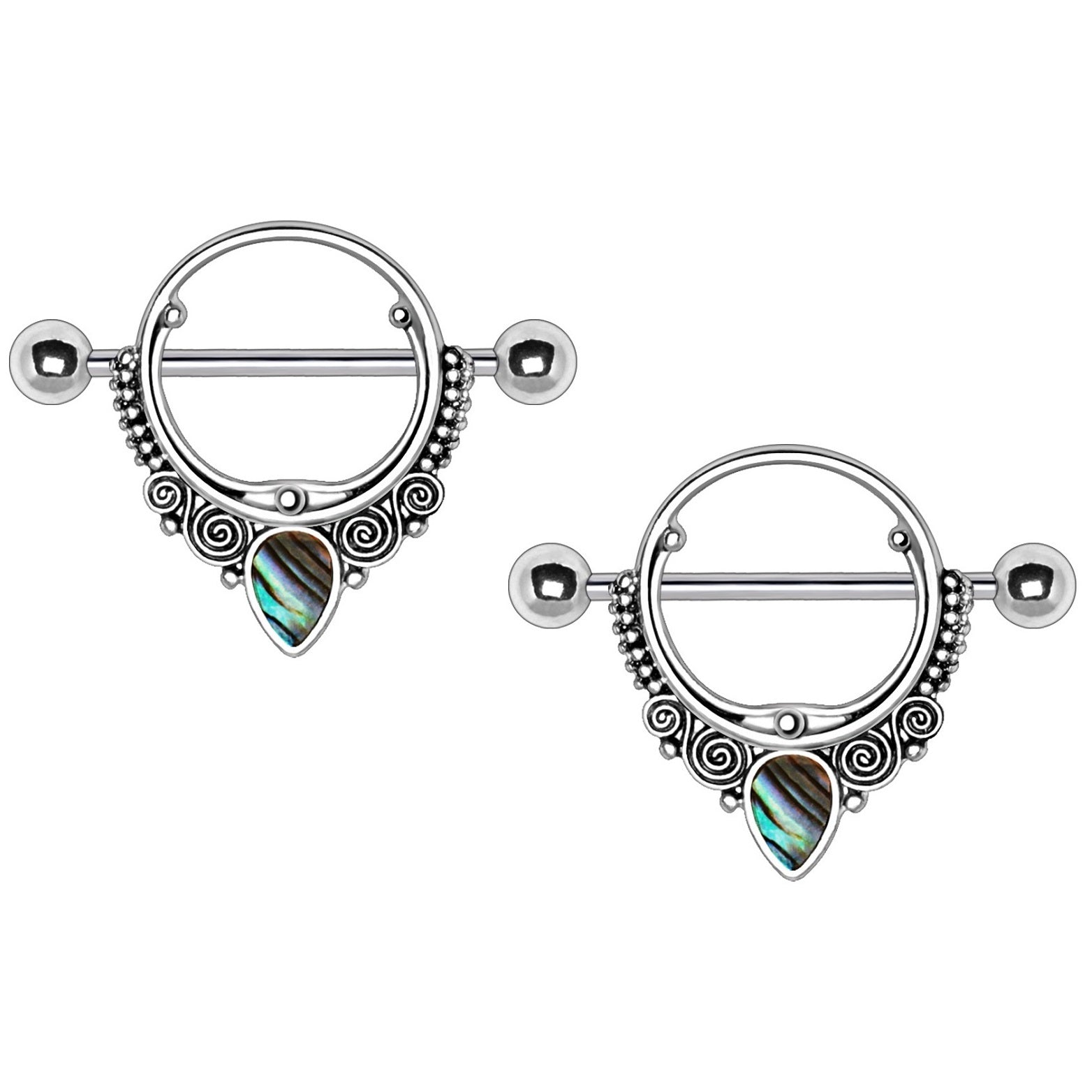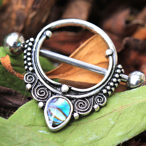 Abalone Teardrop Ornate Nipple Shields - Stainless Steel - Pair