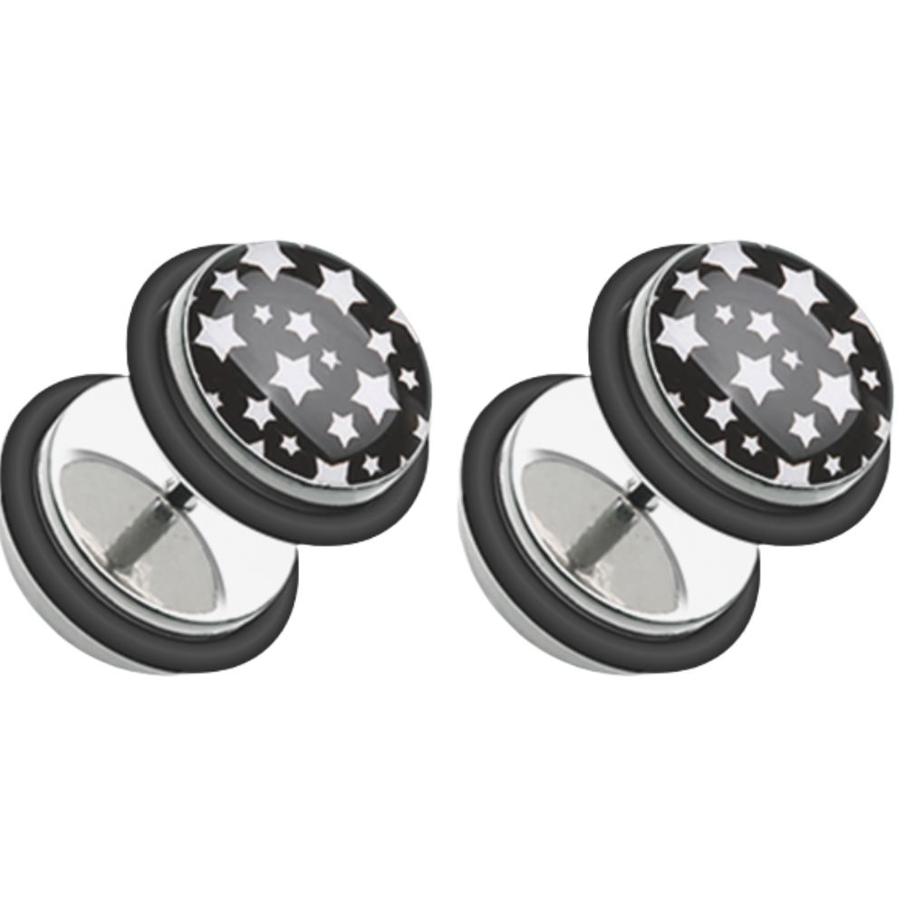 Black and White Multi Star Fake Plugs with Black O-RIngs - Pair - 316L Stainless Steel