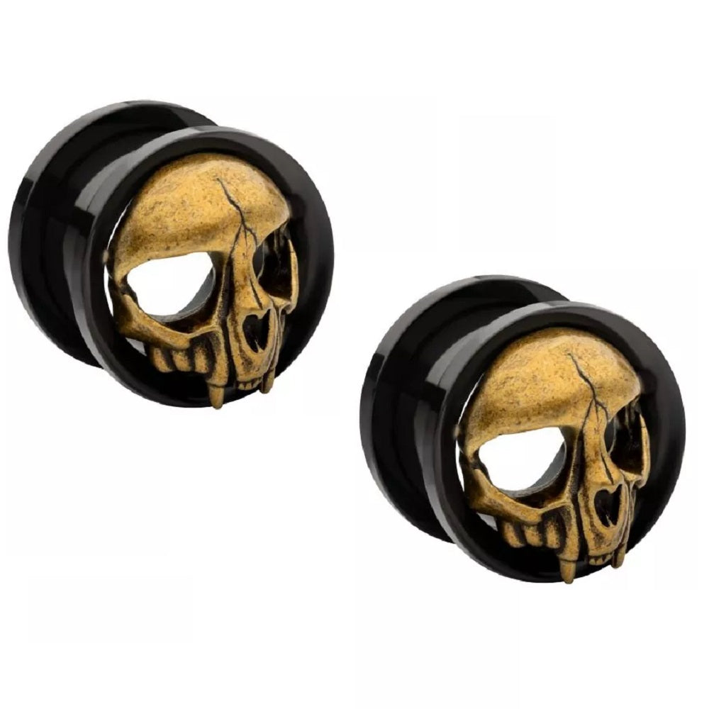 Brass Skull Head Screw Fit Plugs - Black PVD 316L Stainless Steel - Pair