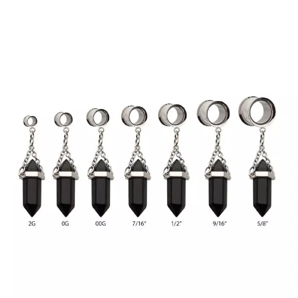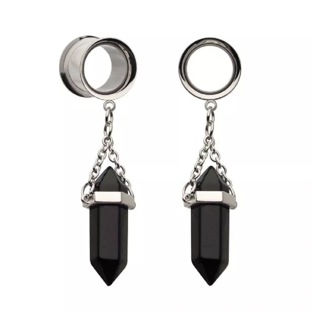 Dangling Obsidian Stone Double Flared Tunnels - 316L Stainless Steel - Pair