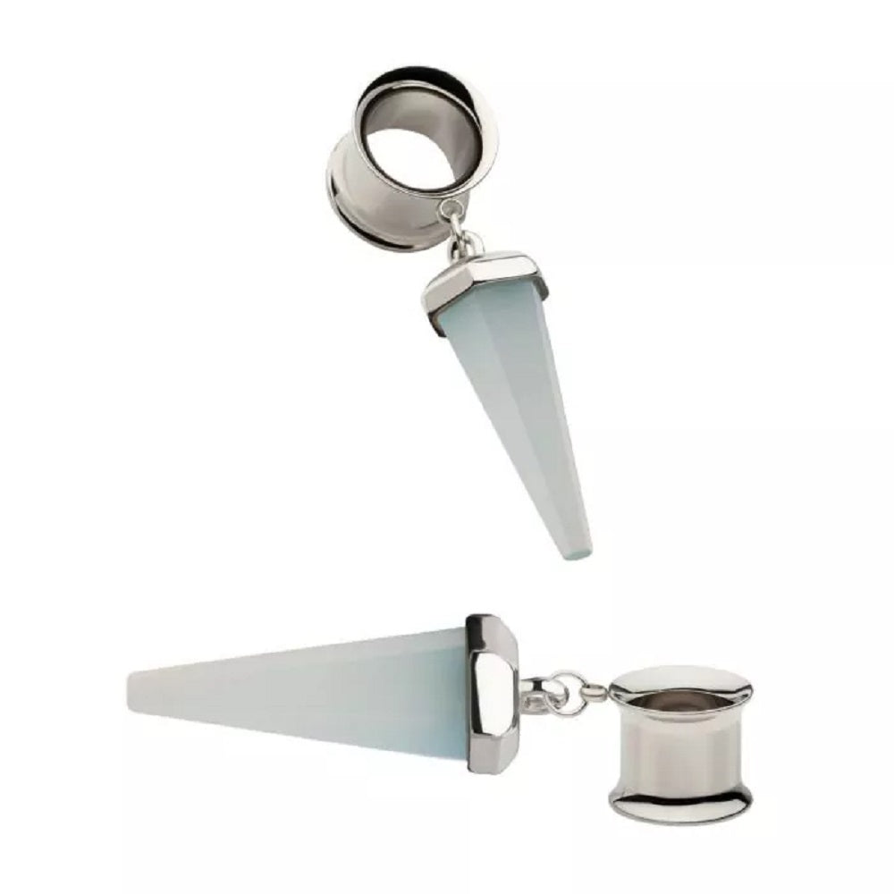 Dangling White Opalite Stone Pendulum Double Flared Tunnels - 316L Stainless Steel - Pair