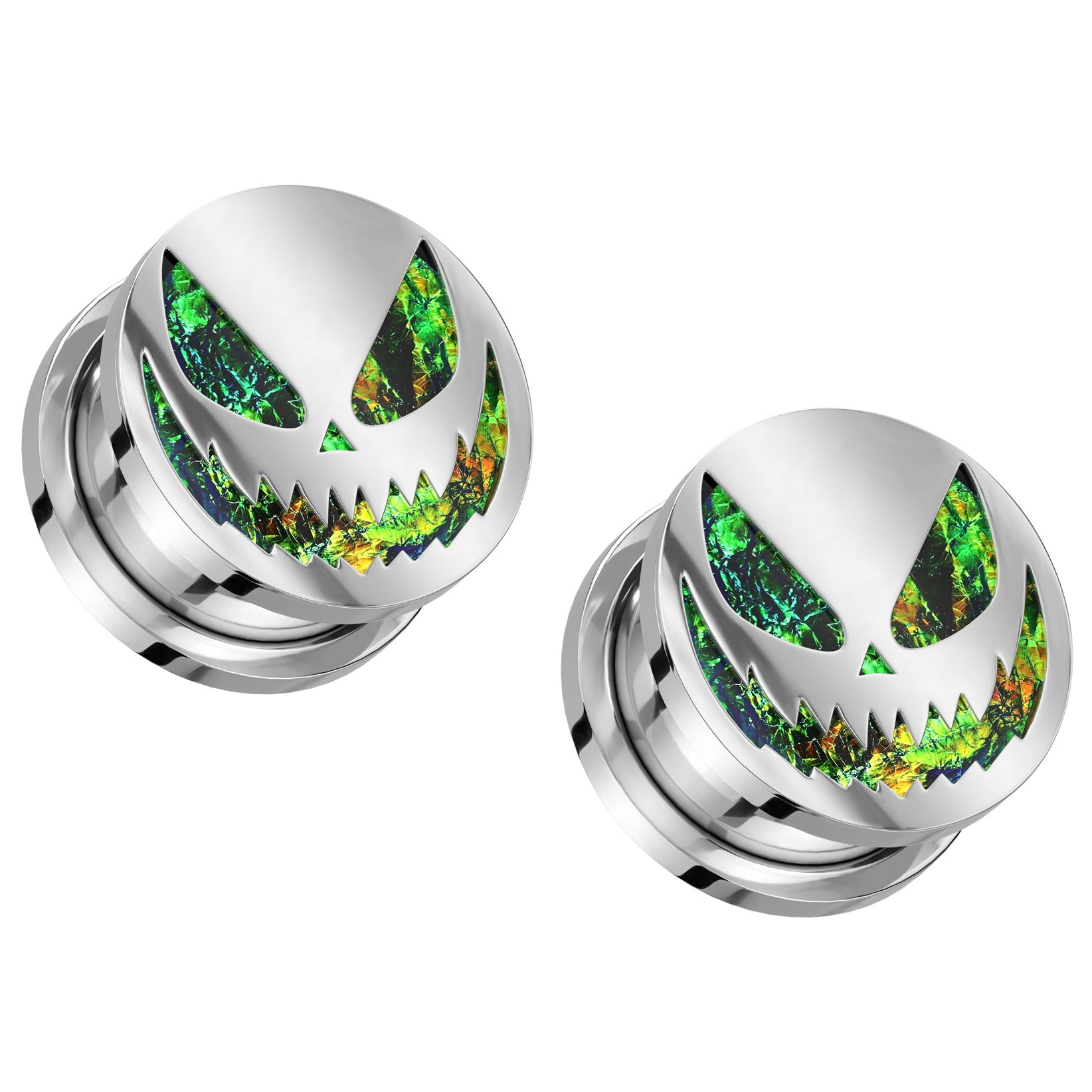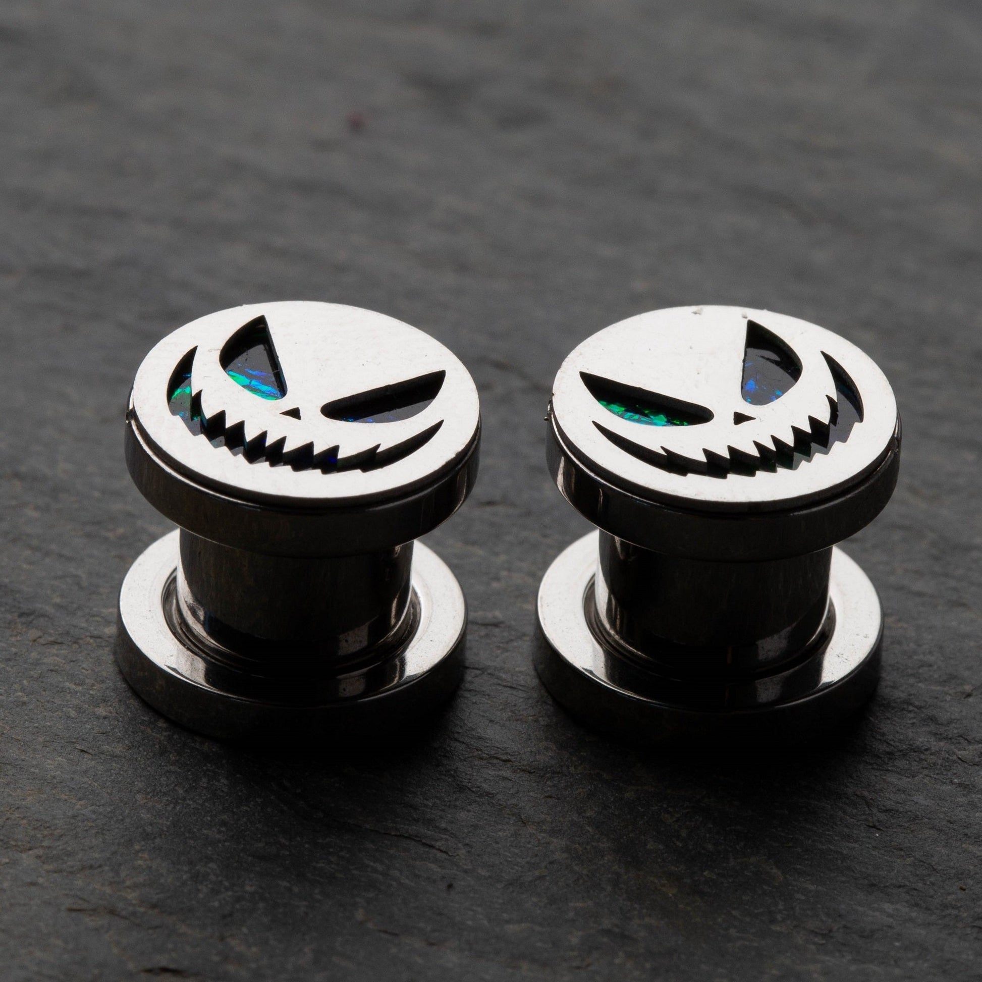 Green Glitter Spooky Halloween Smile Screw Fit Plugs - 316L Stainless Steel - Pair