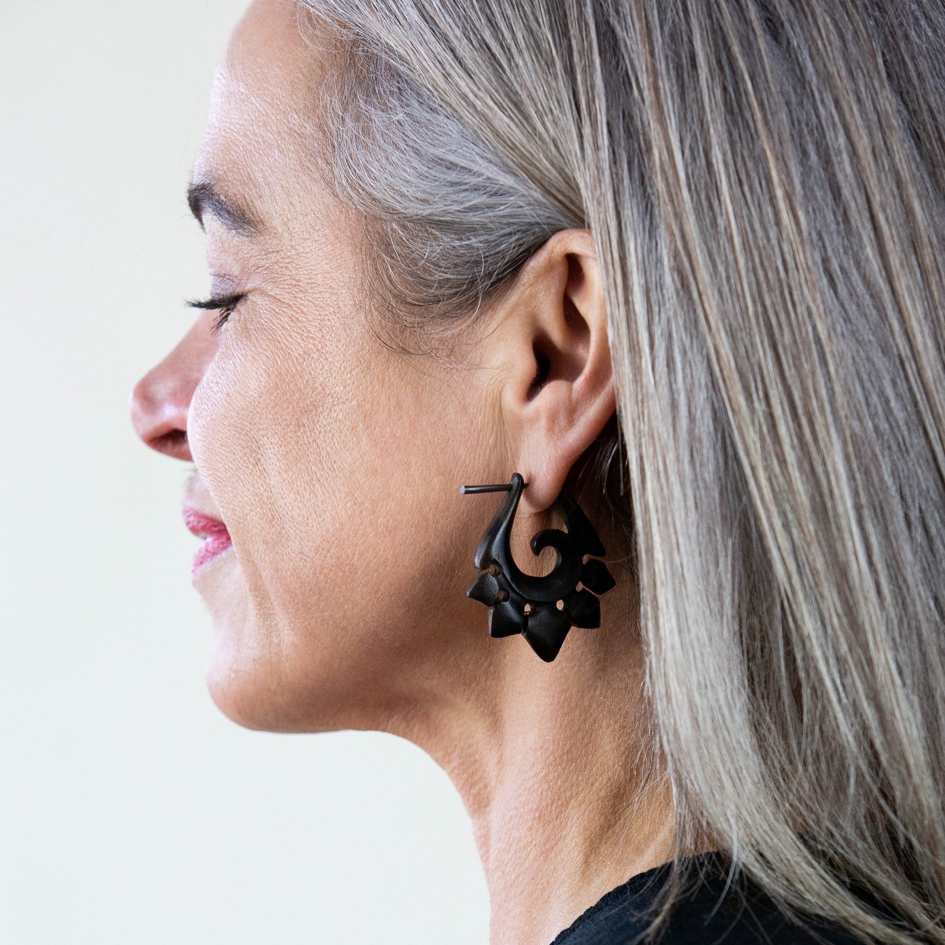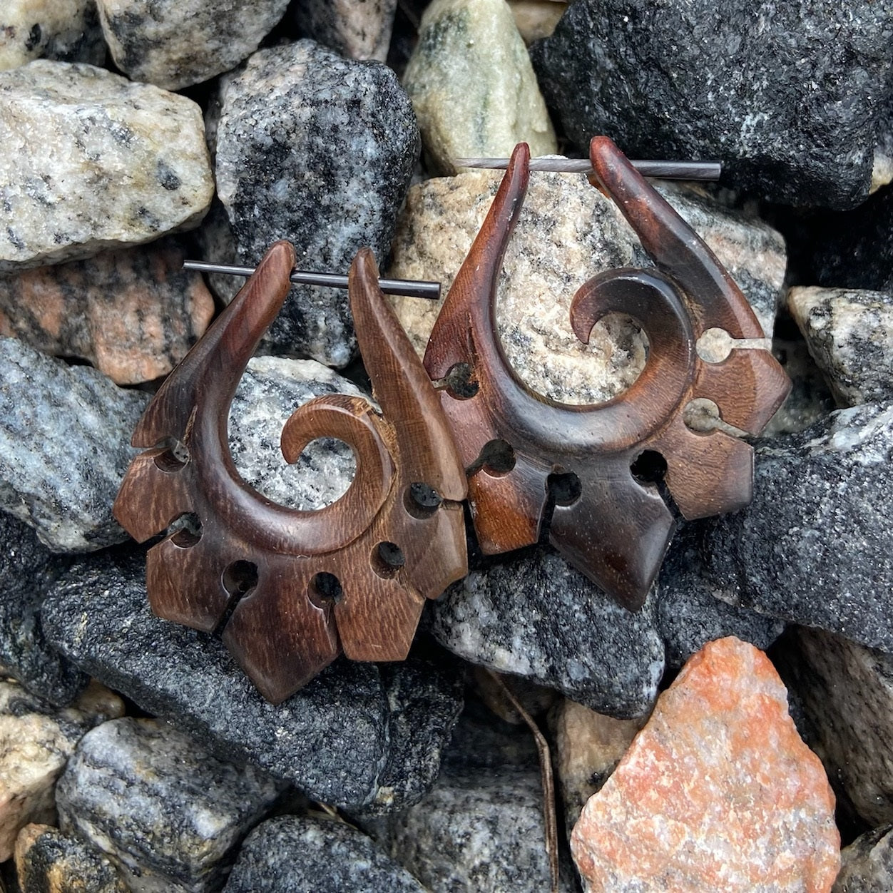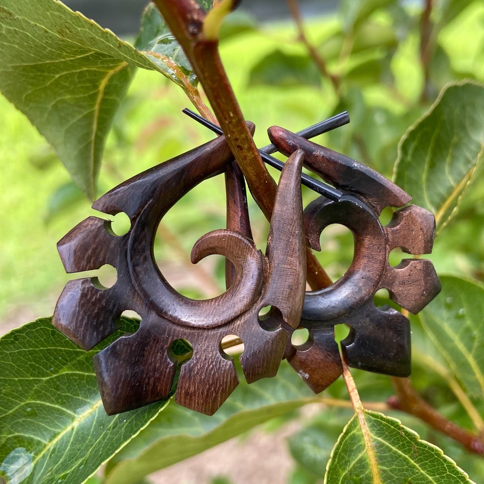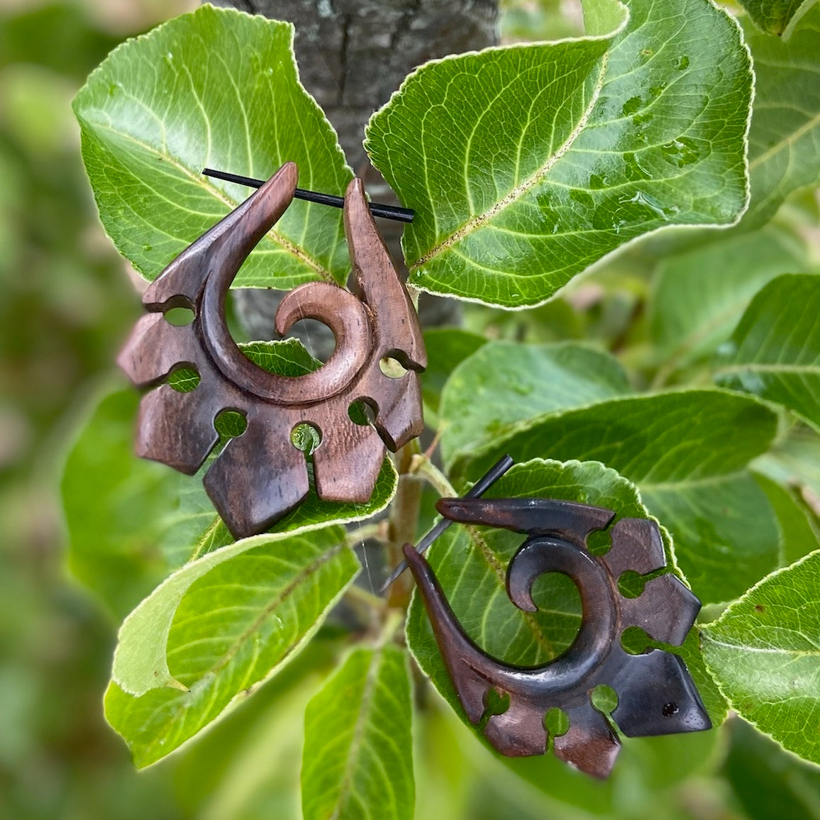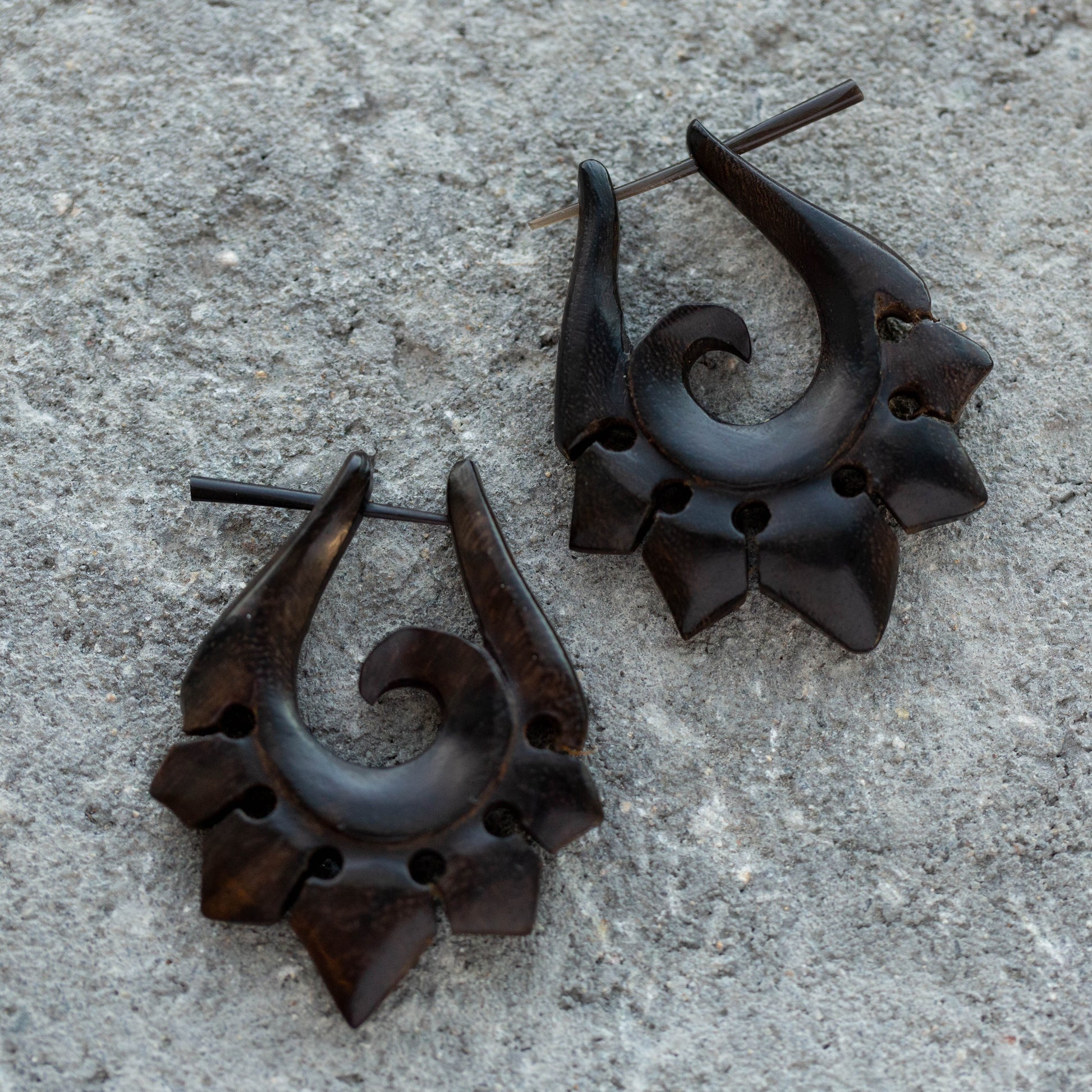 Organic Hand Carved Sono Wood Tribal Ornament Stirrup Hanger Earrings
