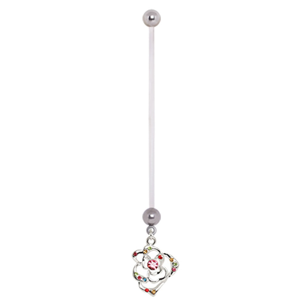 Silver Tone Multi Colored CZ Flower Dangling BioFlex Maternity Pregnancy Dangling Belly Button Ring - Stainless Steel