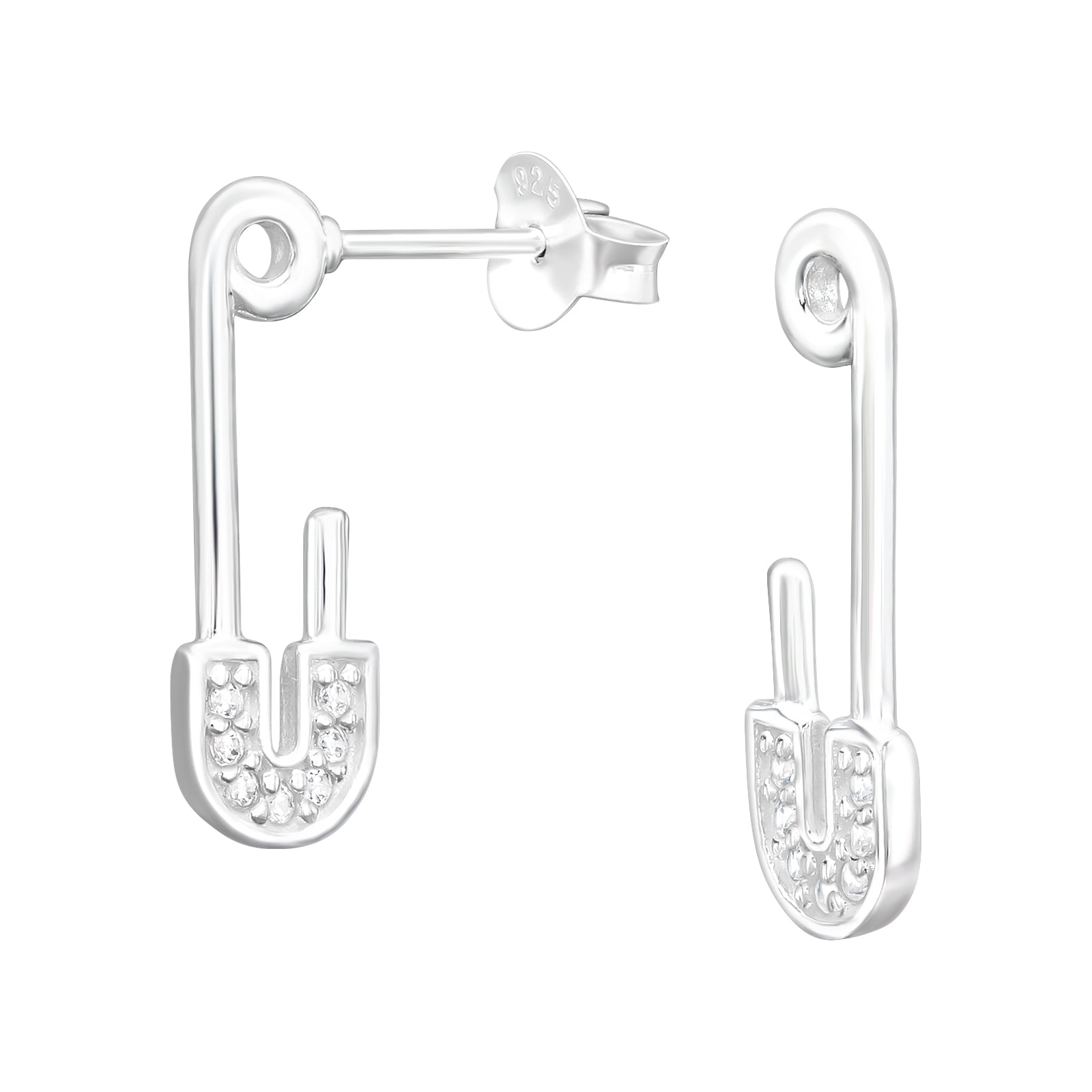 CZ Crystal Safety Pin Stud Earrings - Pair - 925 Sterling Silver