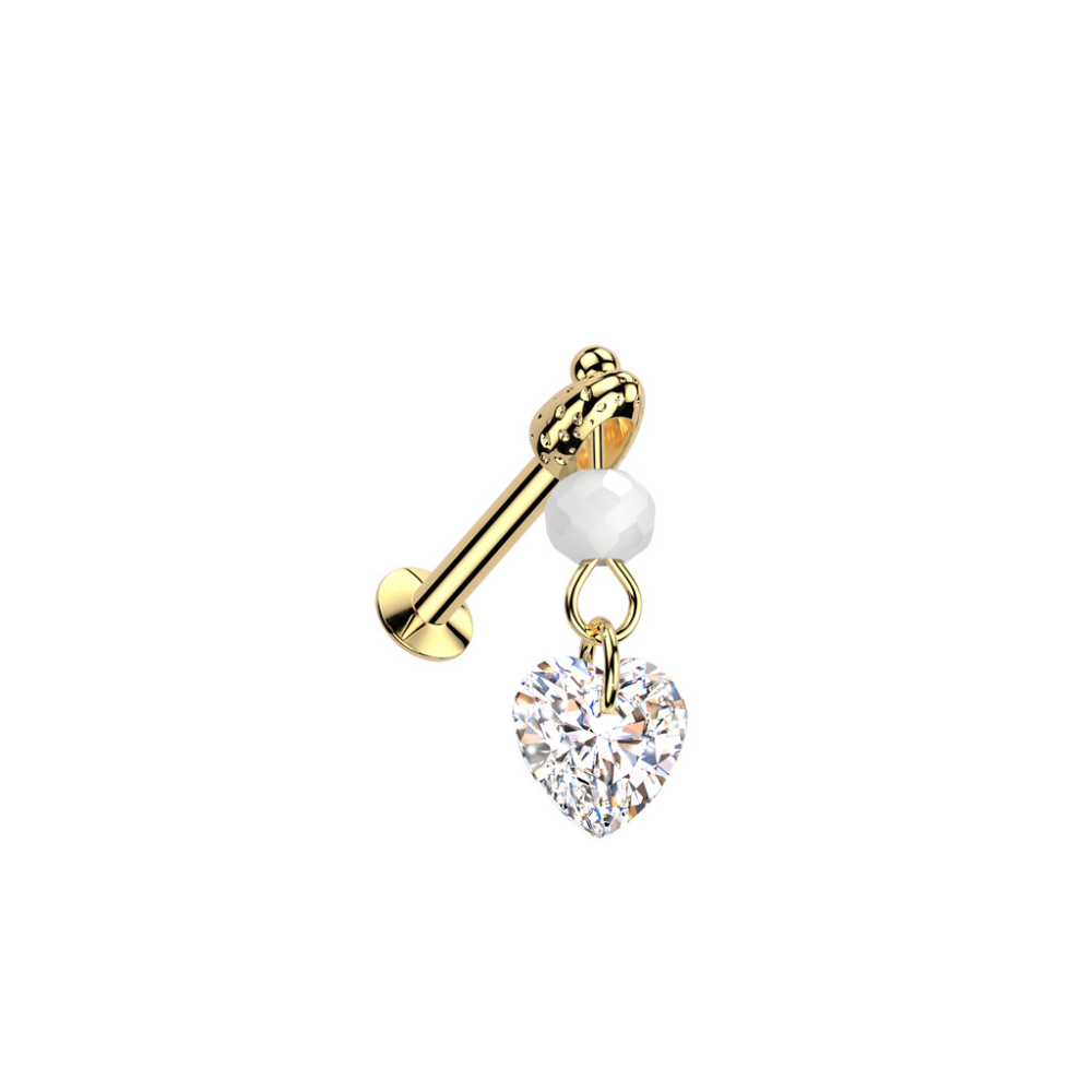 Threadless Push In Dangling Faux Pearl and Heart Shaped Crystal Flat Back Stud - 316L Stainless Steel
