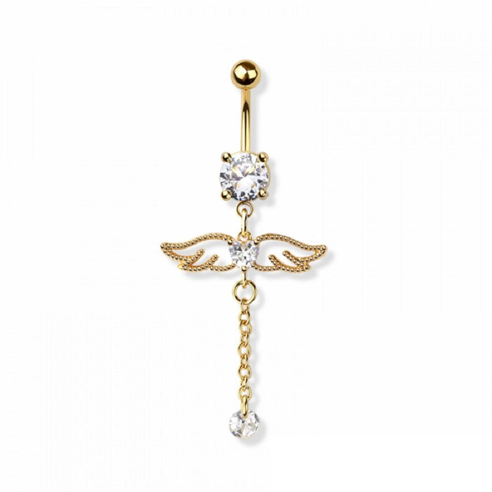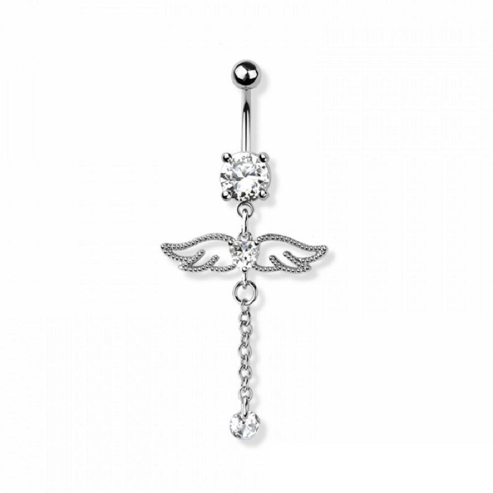 CZ Crystal Angel Wings with Dangling Chain Belly Button Ring - 316L Stainless Steel
