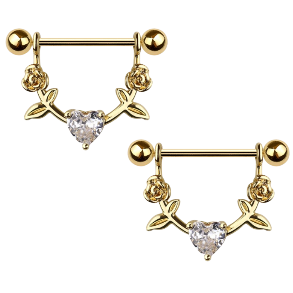 Dangling CZ Crystal Heart with Roses Nipple Barbells - Pair - 316L Stainless Steel