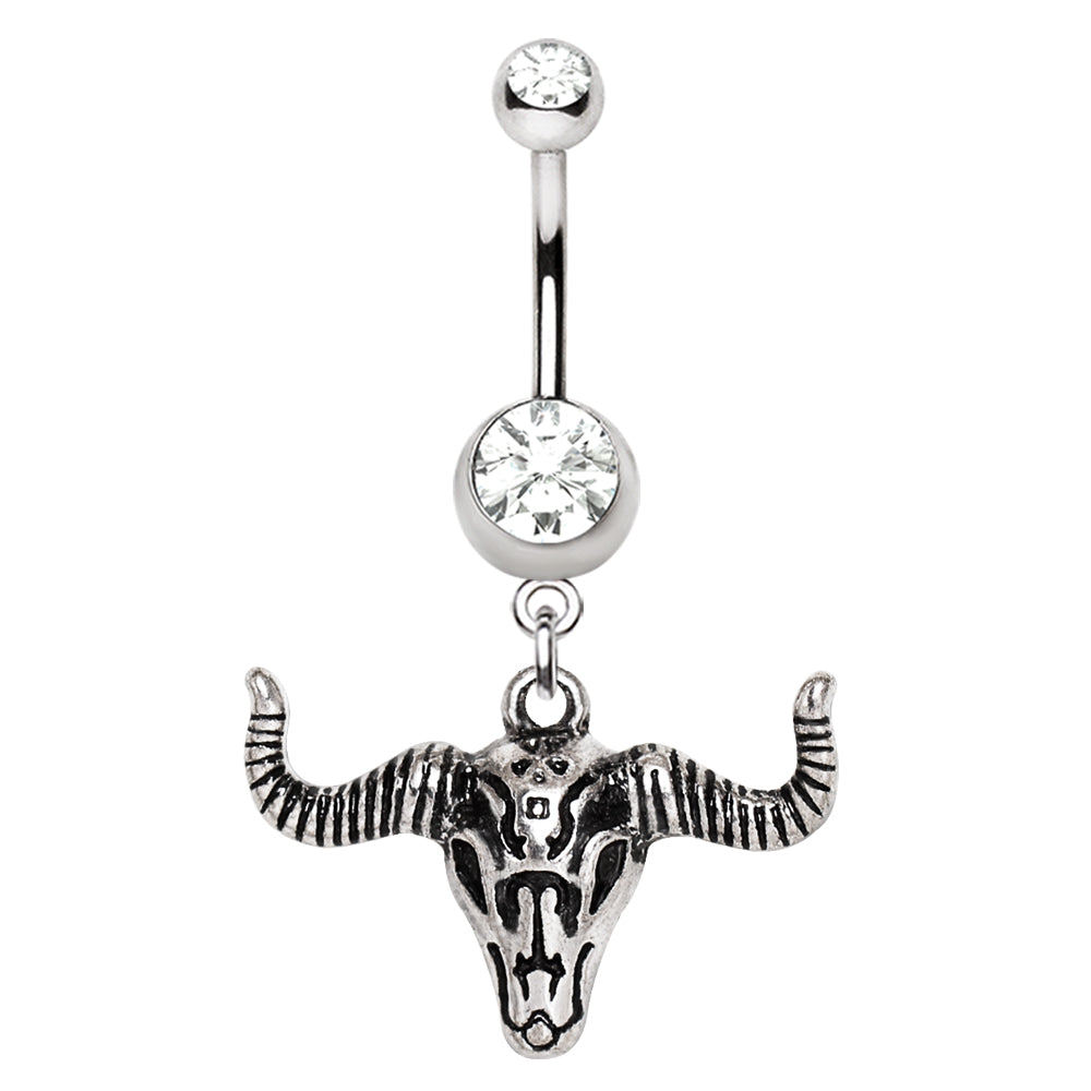 Antique Bull Skull Head Dangle Belly Button Ring - Stainless Steel
