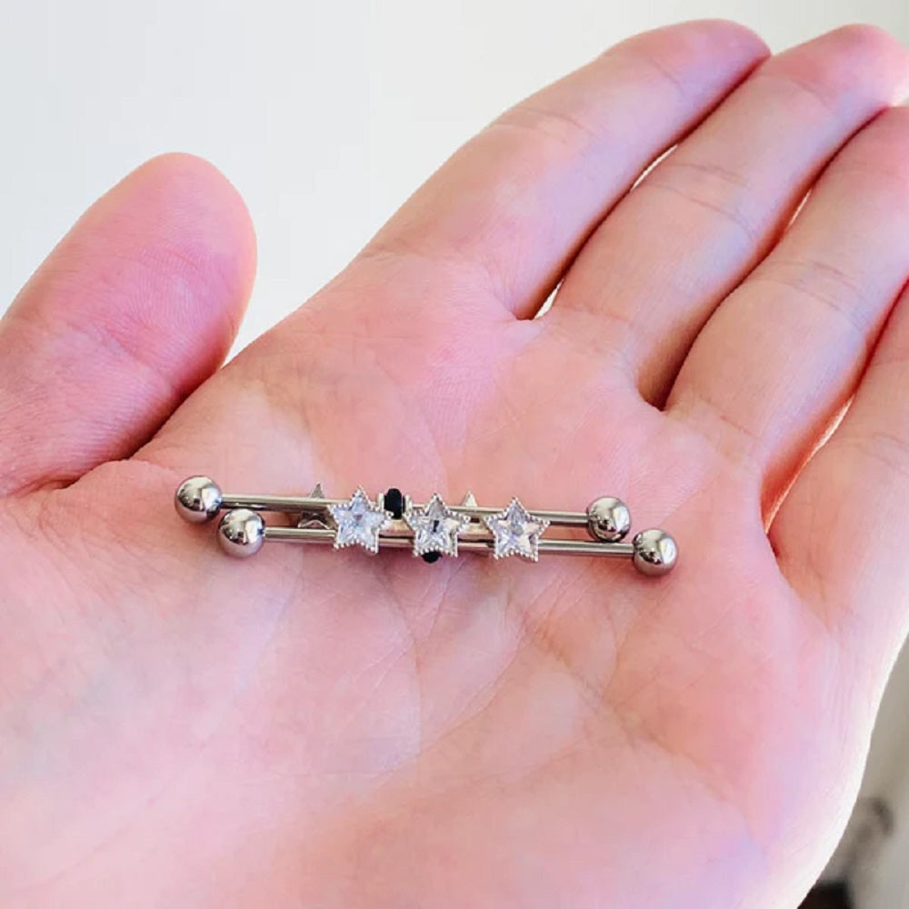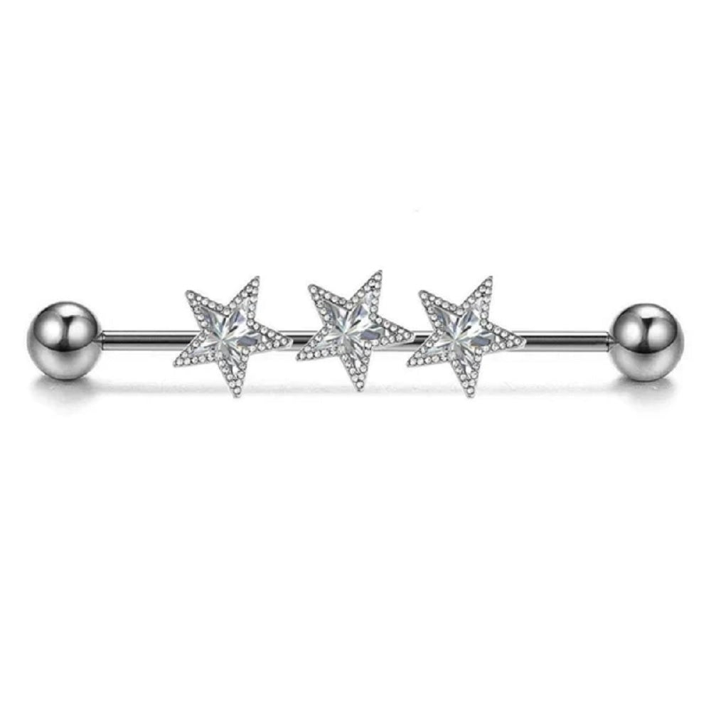 CZ Crystal Triple Stars Industrial Barbell - 316L Stainless Steel