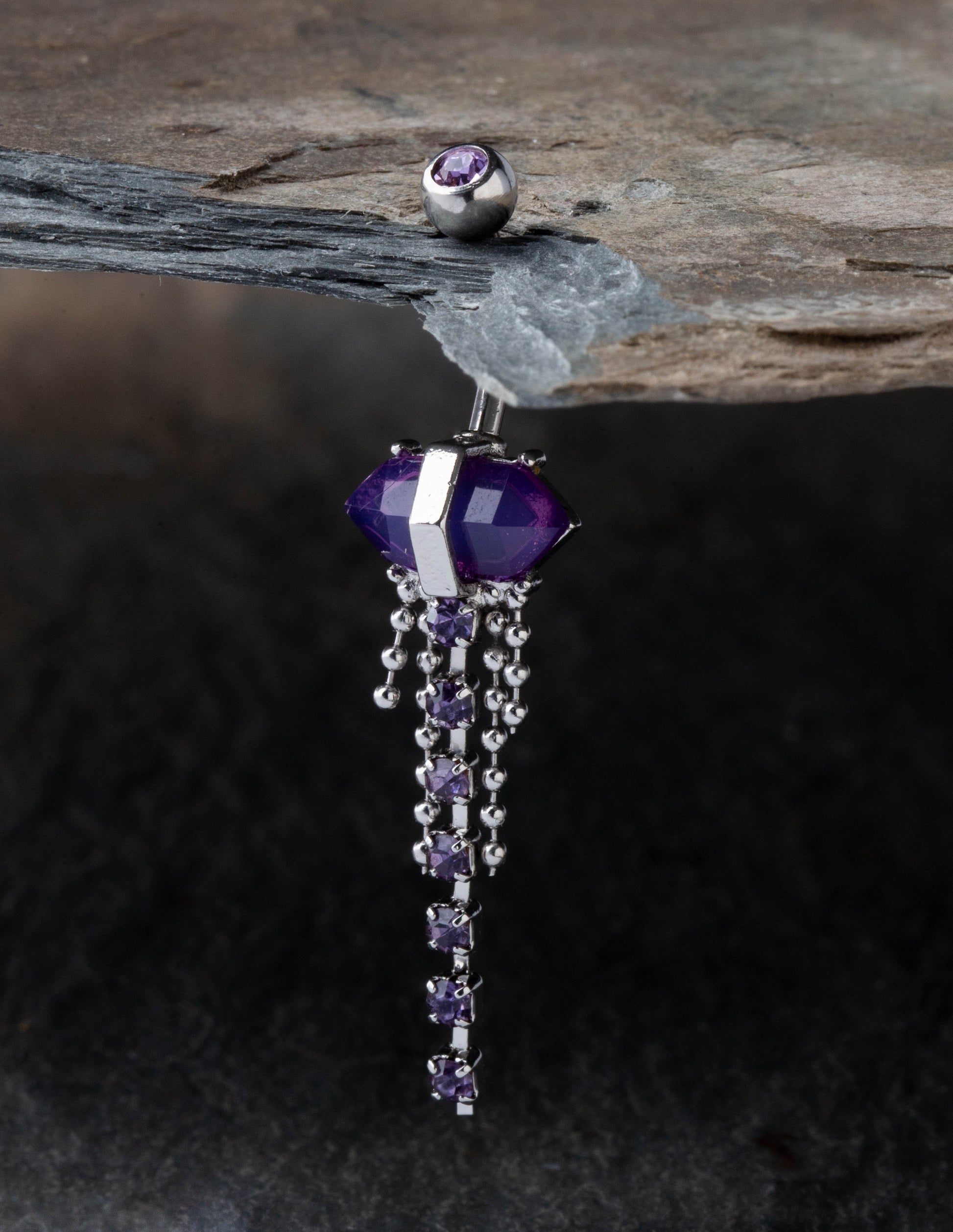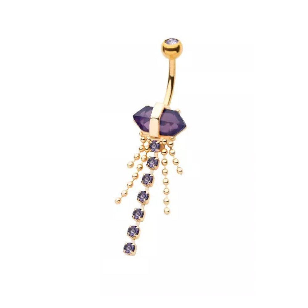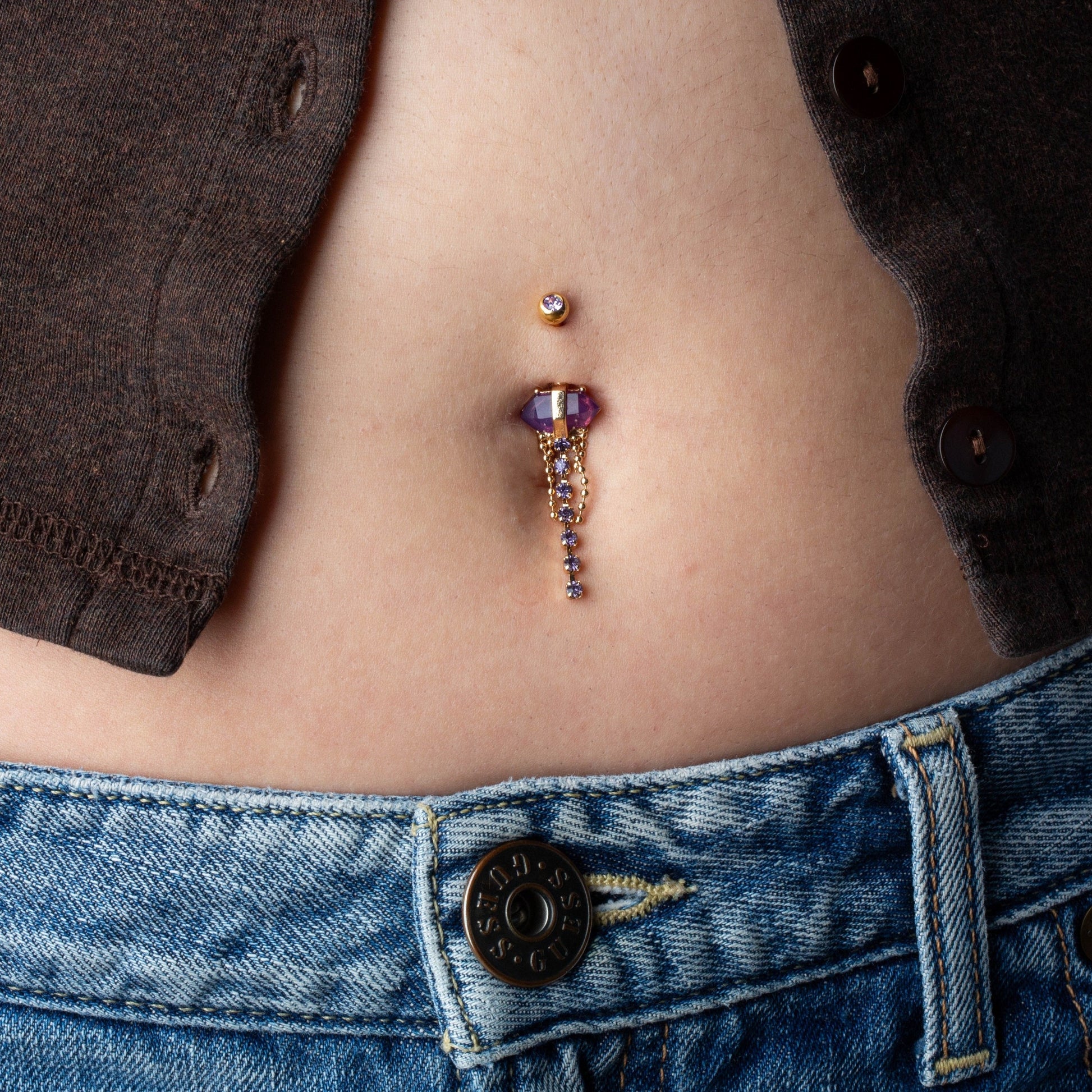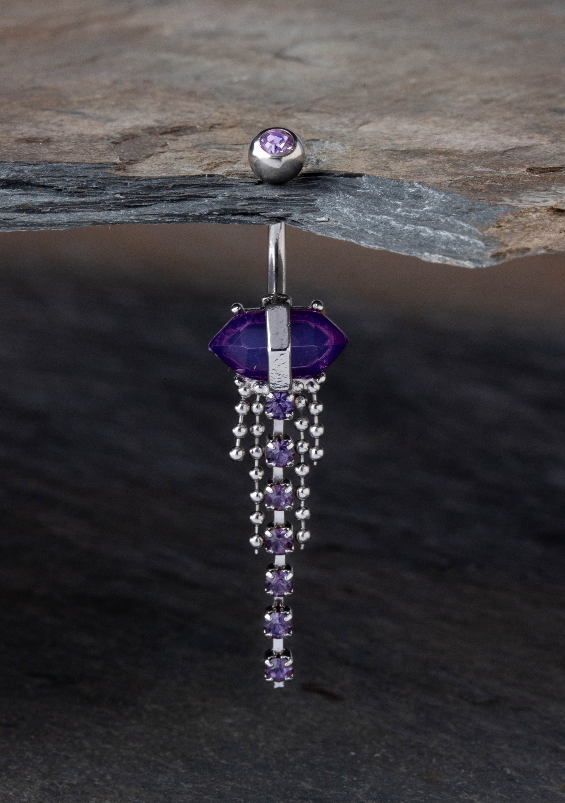 Amethyst Crystal with Dangling Gems and Beads Belly Button Ring - 316L Stainless Steel
