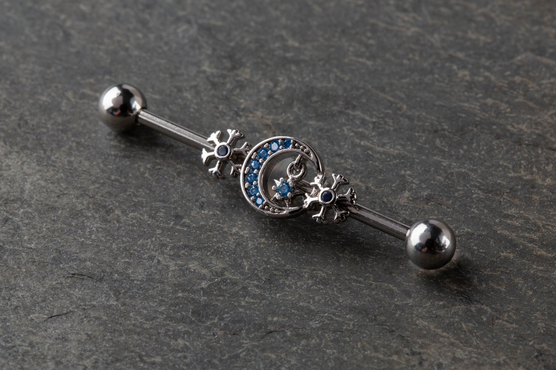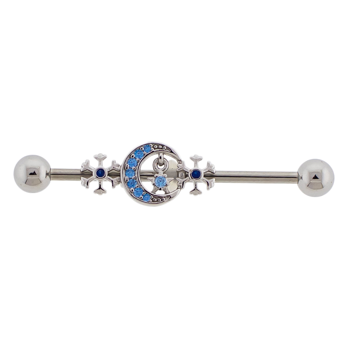 Aqua CZ Crystal Crescent Moon and Snowflakes Industrial Barbell - 316L Stainless Steel