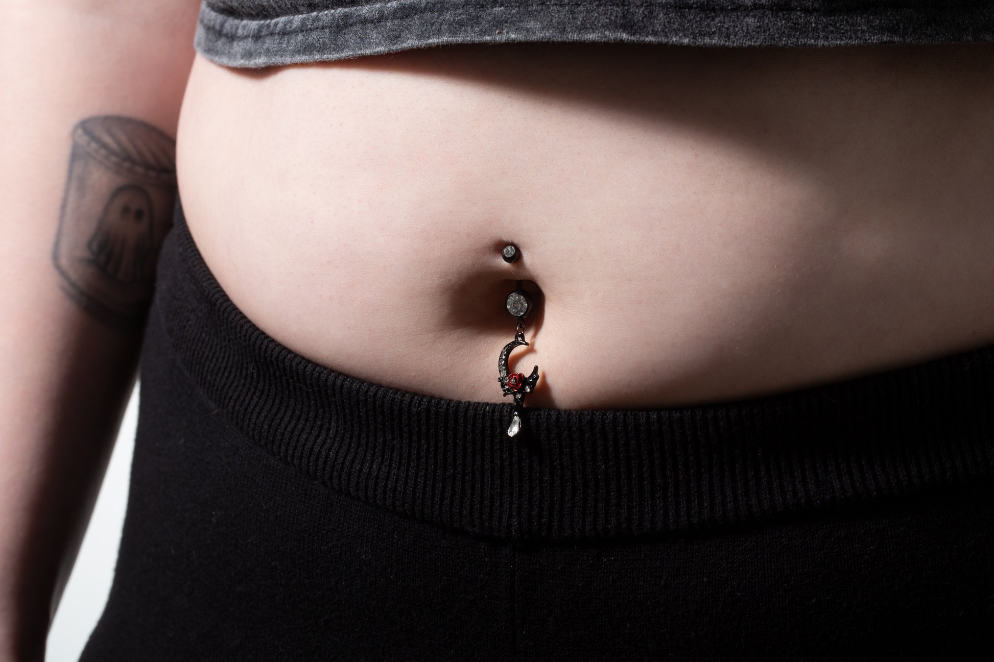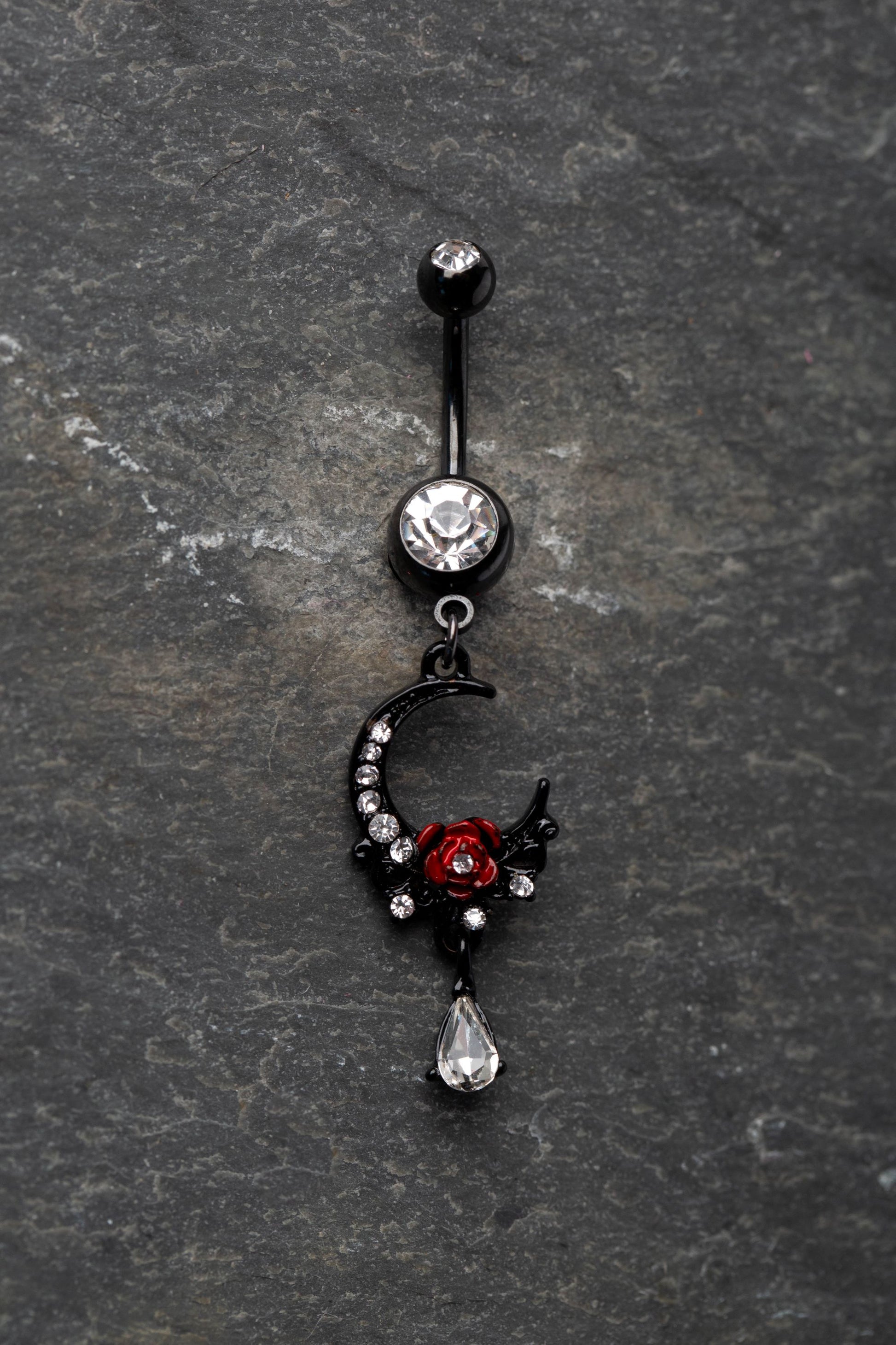 Black CZ Crystal Crescent Moon with Rose and Dangling Gem Belly Button Ring - 316L Stainless Steel