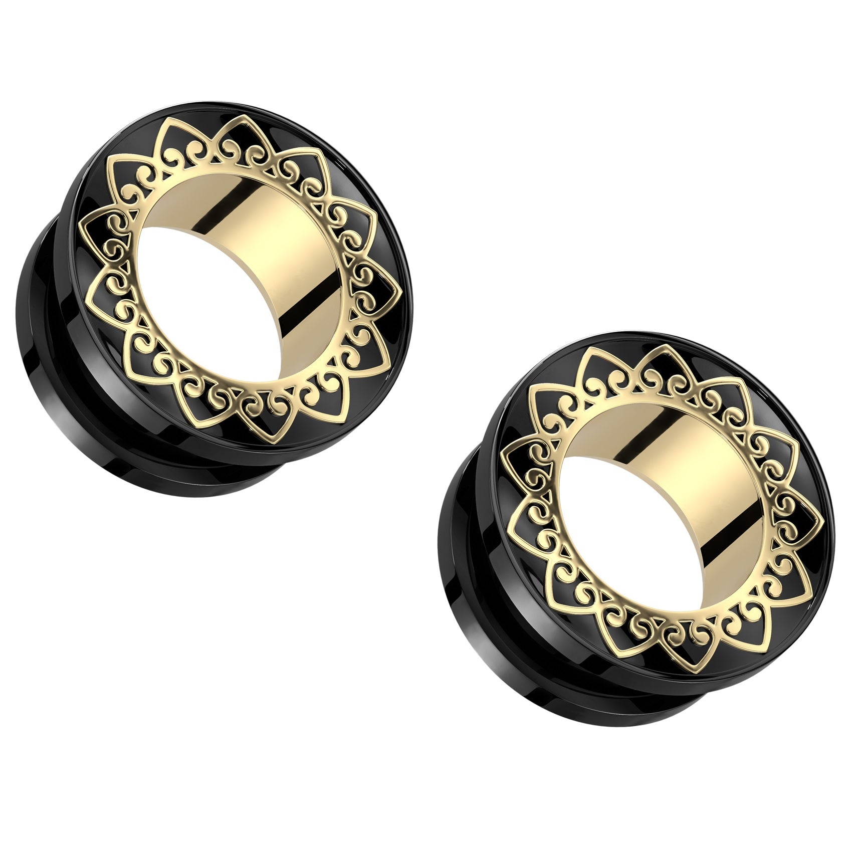 Black PVD Gold Filigree Rim Screw Fit Tunnels - 316L Stainless Steel - Pair