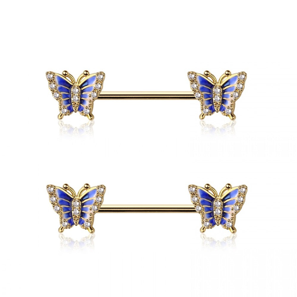 Blue CZ Crystal Butterfly Ends Nipple Barbells - Pair - 316L Stainless Steel