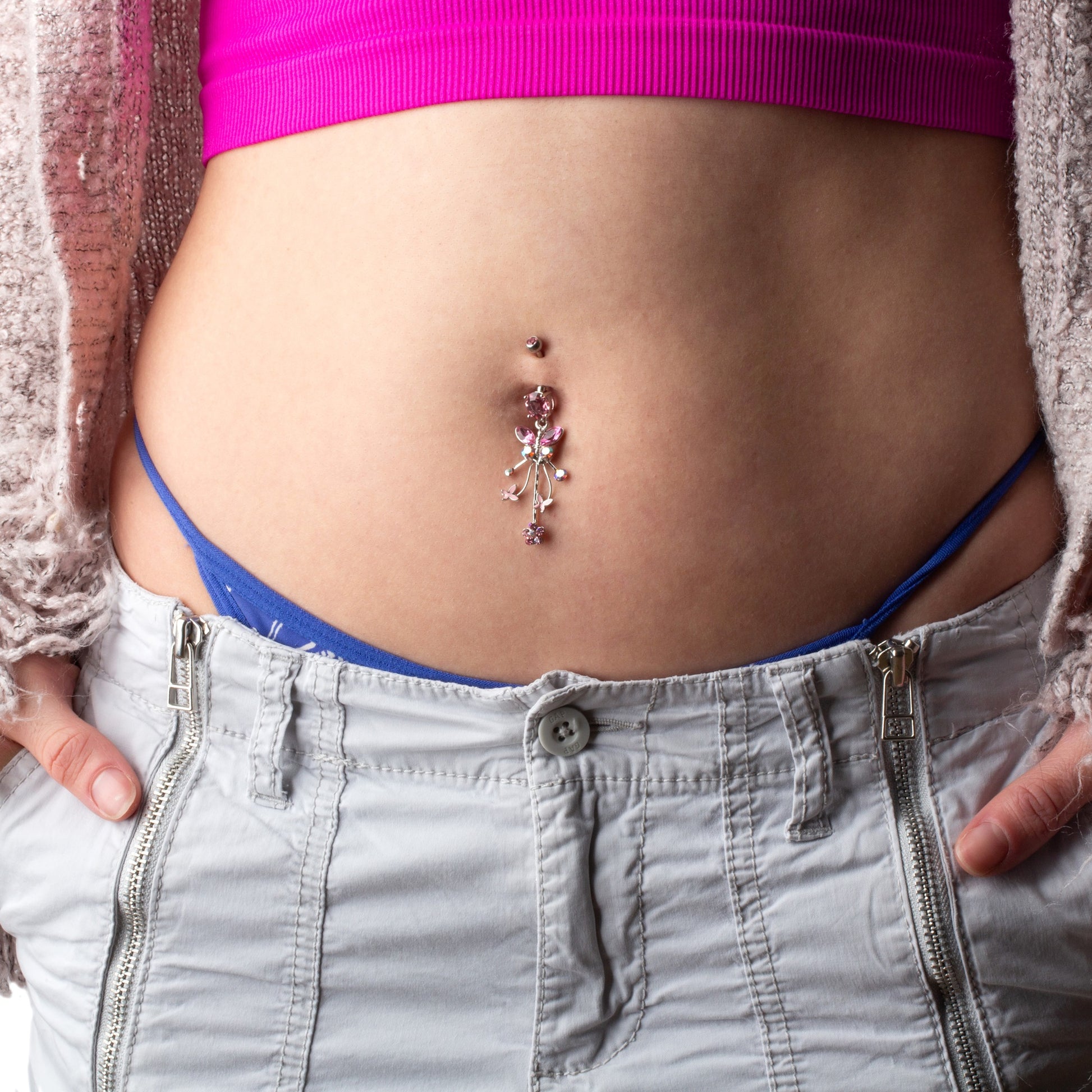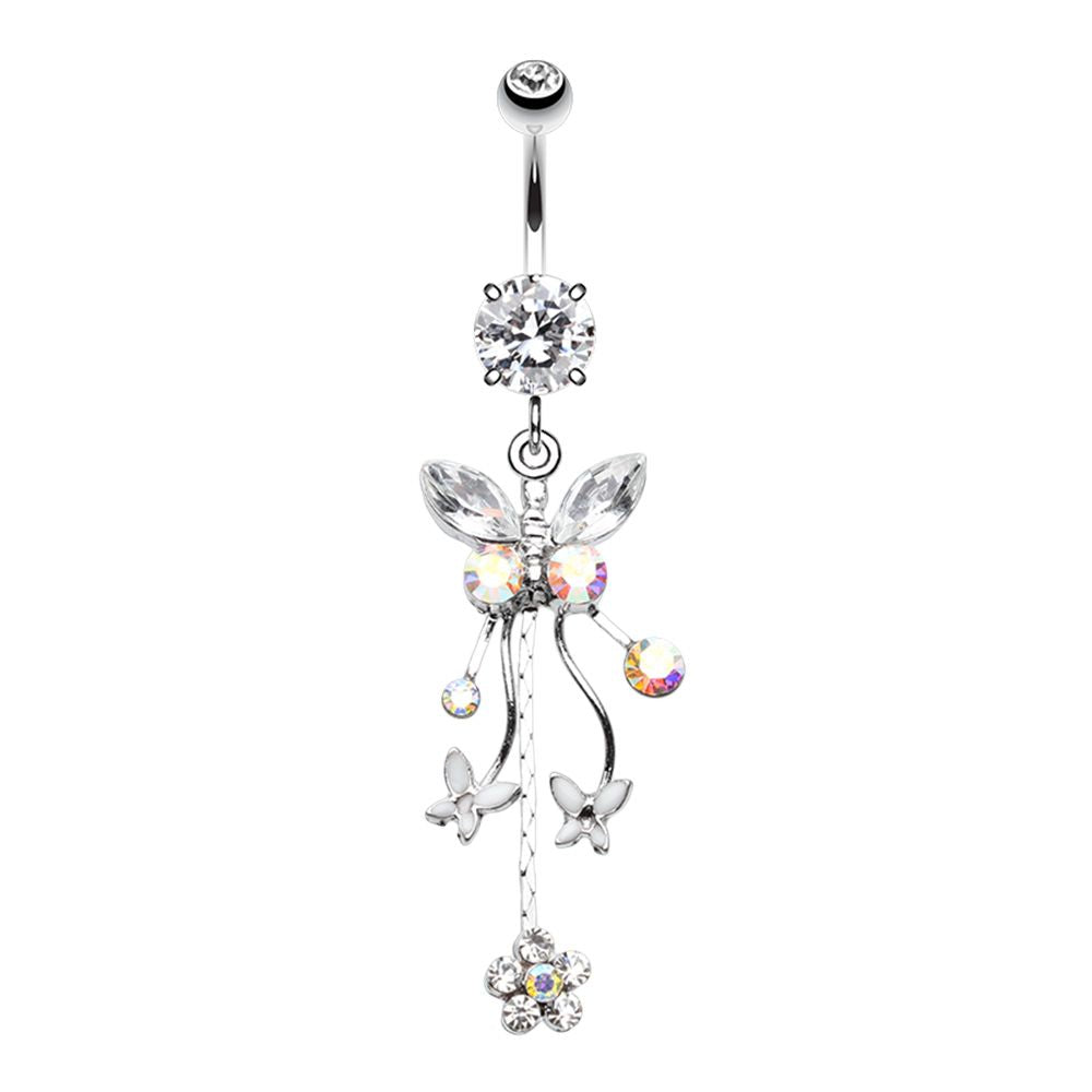 Butterfly with Dangling Charms Belly Button Ring - Stainless Steel