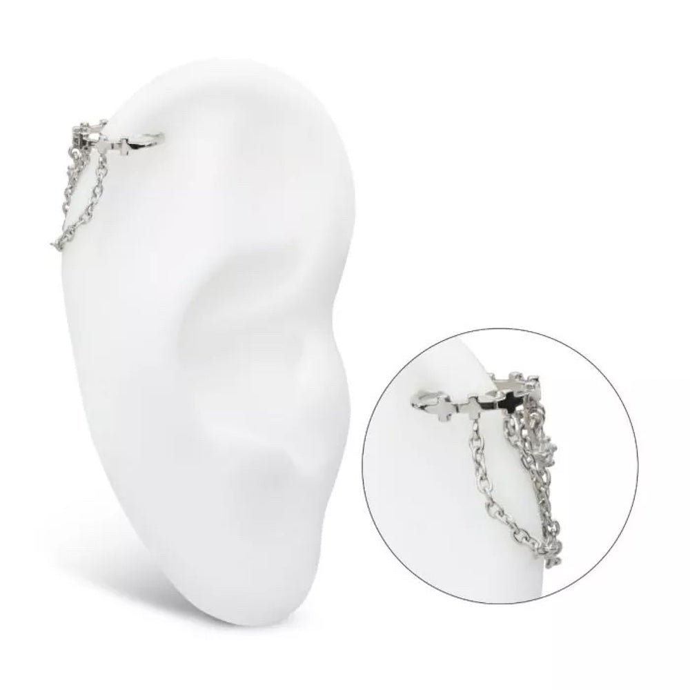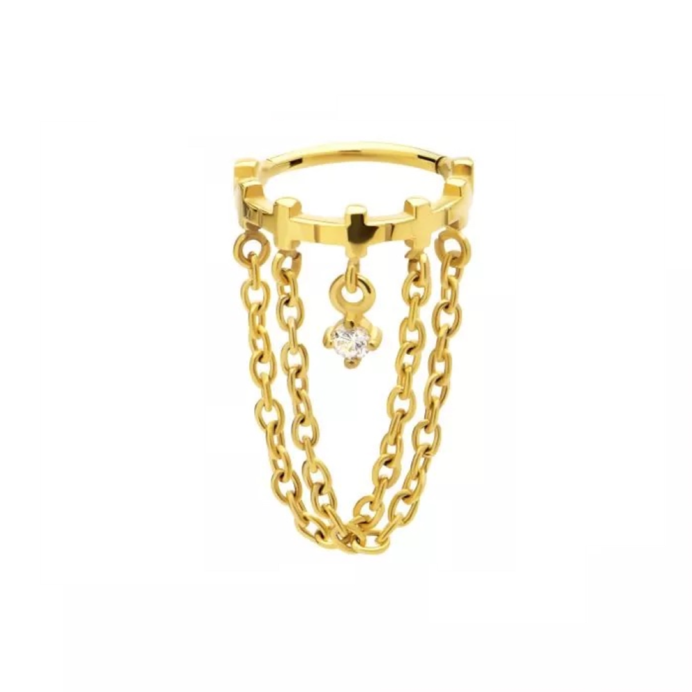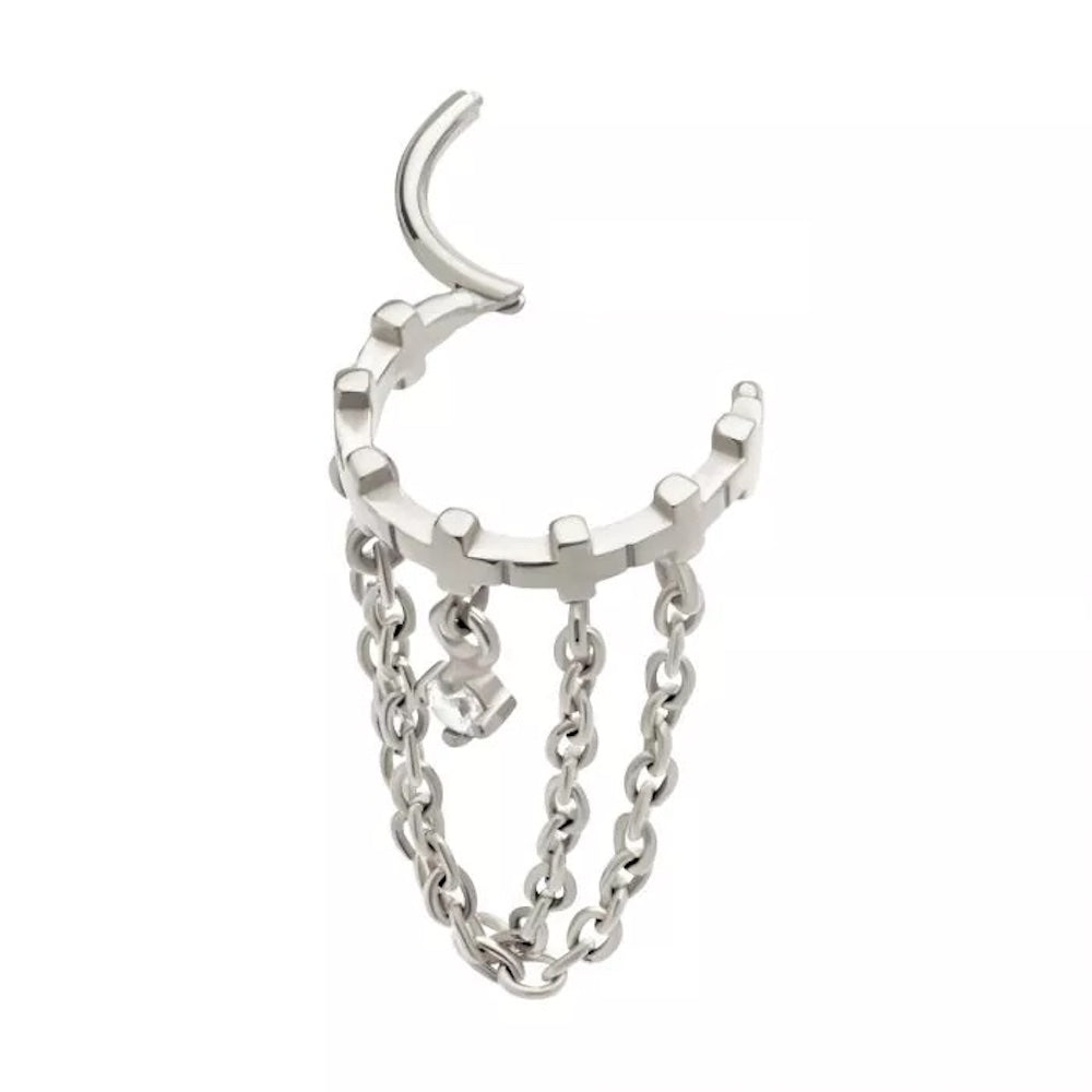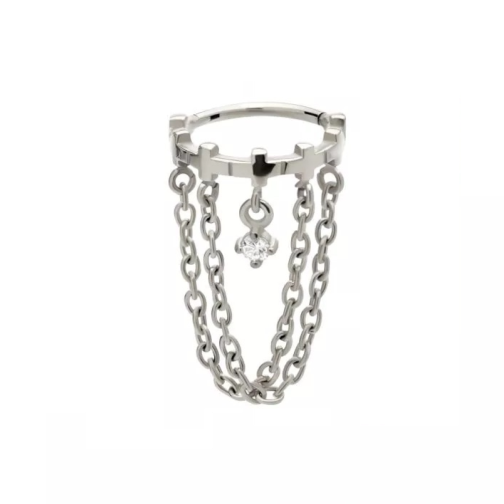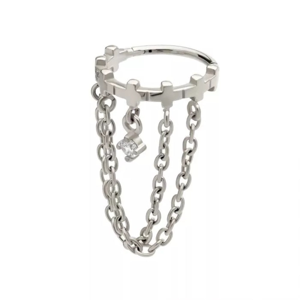 Cross Lined with Double Dangling Chains and Gem Hinged Segment Clicker Ring - 316L Stainless Steel