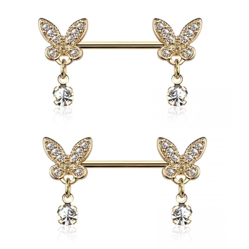 CZ Crystal Butterfly Ends with Dangling Gems Nipple Barbells - 316L Stainless Steel - Pair