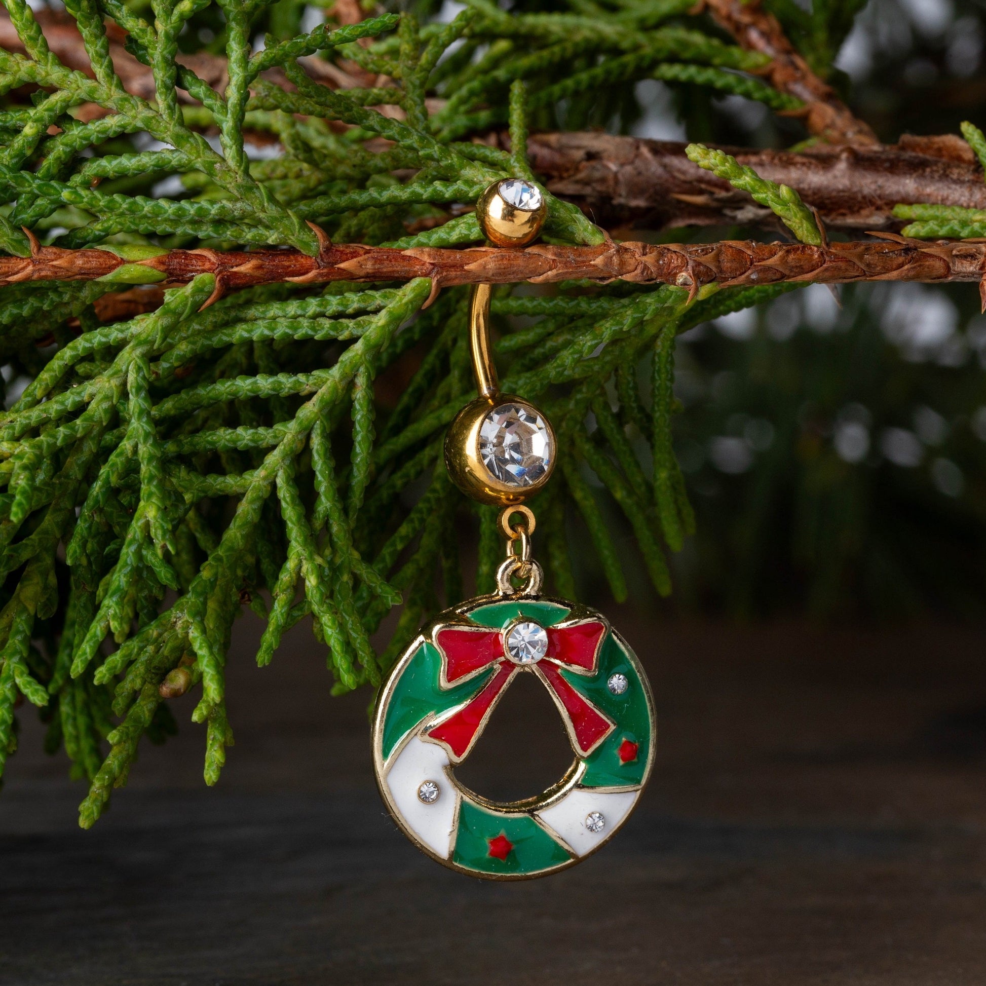 CZ Crystal Christmas Bow Wreath Icon Dangling Belly Button Ring - Gold Plated 316L Stainless Steel