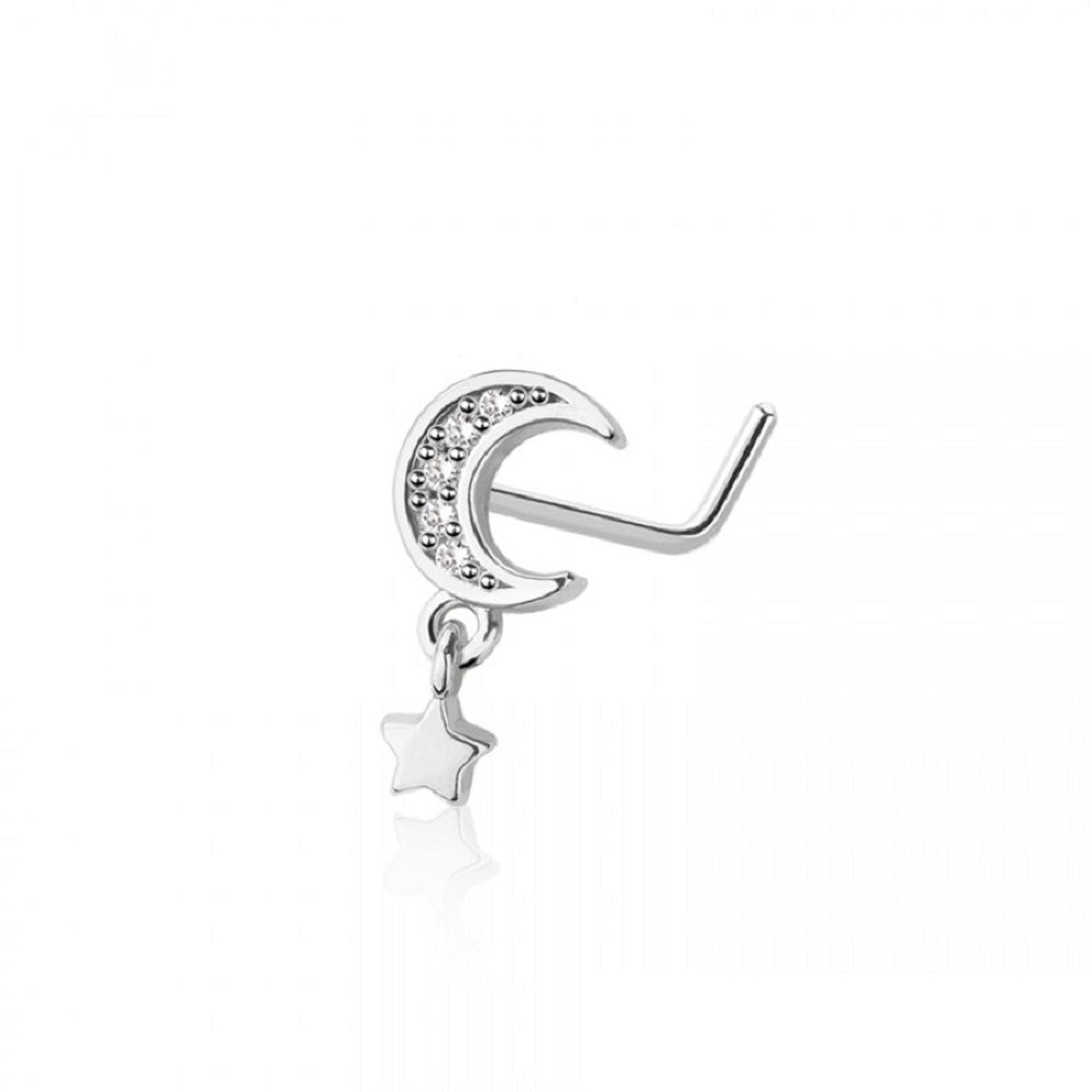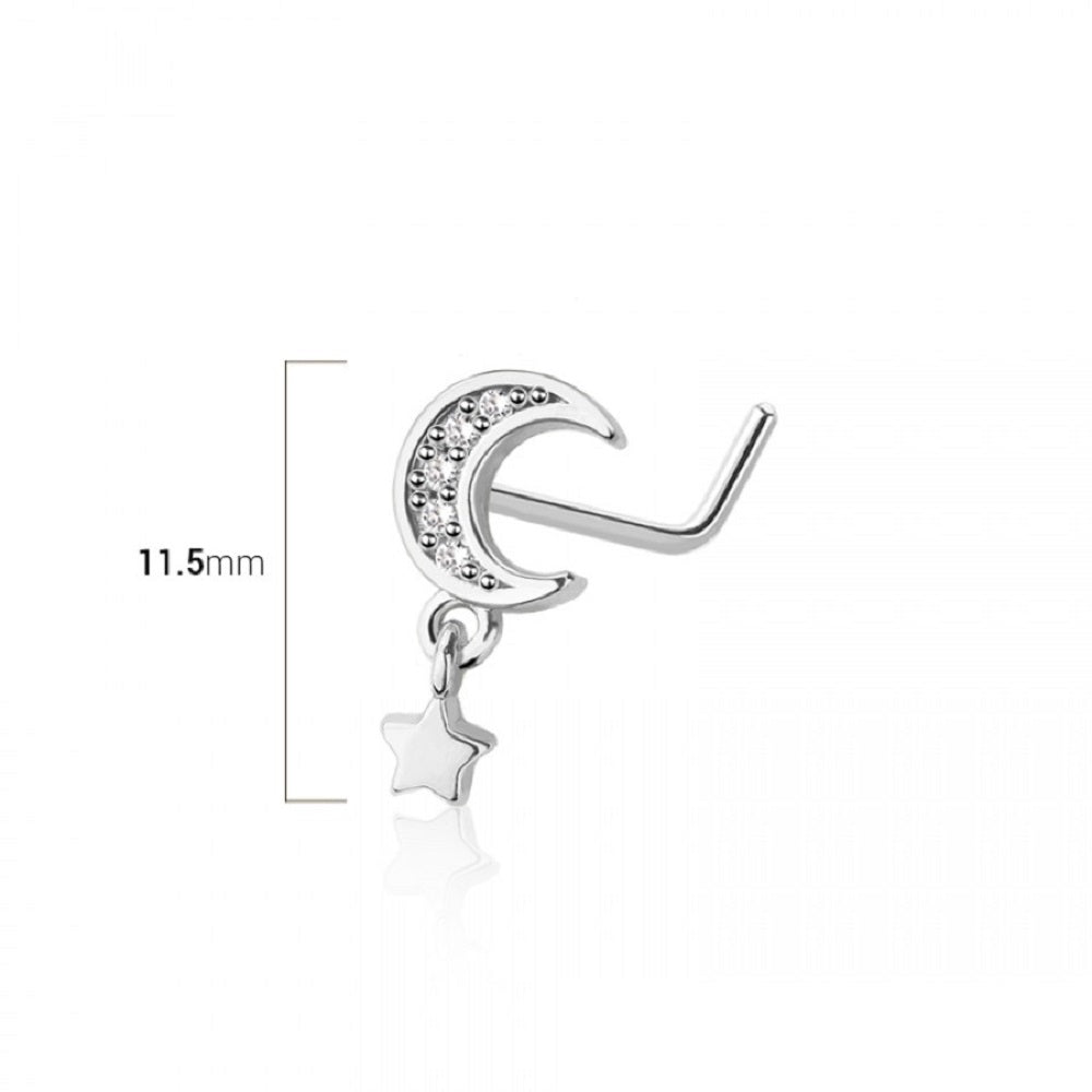 CZ Crystal Crescent Moon with Dangling Star L-Bend Nose Stud - 316L Stainless Steel