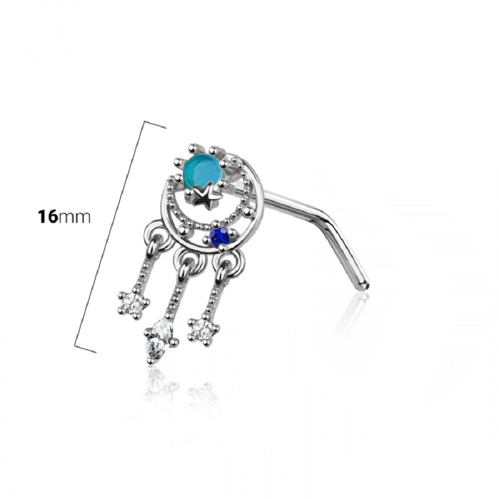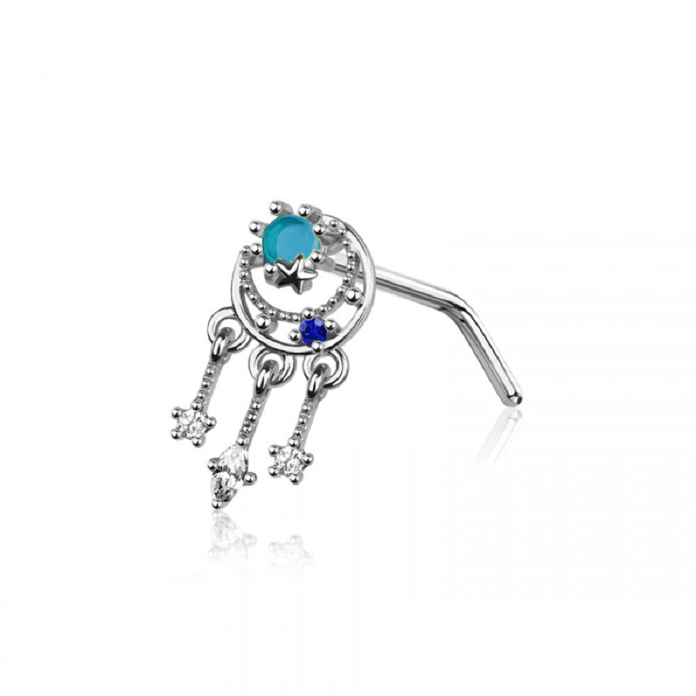 CZ Crystal Crescent Moon with Dangling Stars L-Bend Nose Stud - 316L Stainless Steel