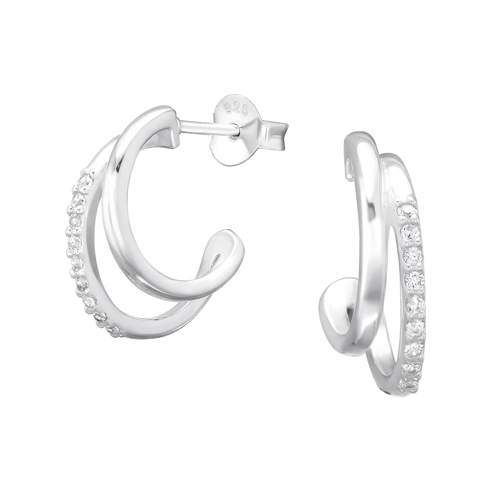 CZ Crystal Lined Split Double Hoop Stud Earrings - Pair - 925 Sterling Silver
