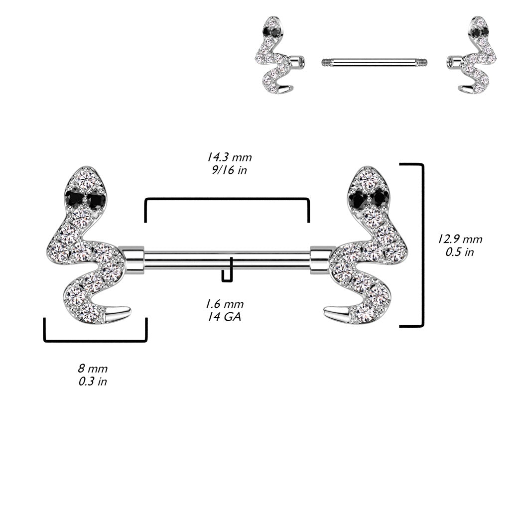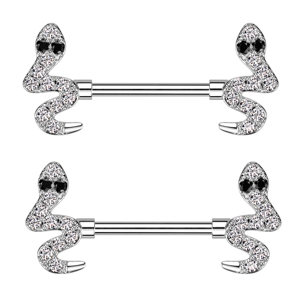 CZ Crystal Snakes Nipple Barbells - 316L Stainless Steel - Pair