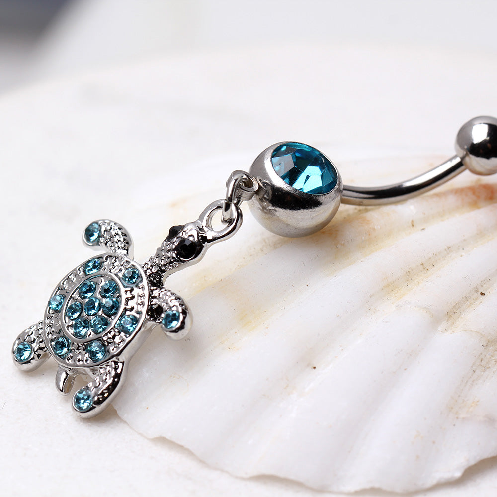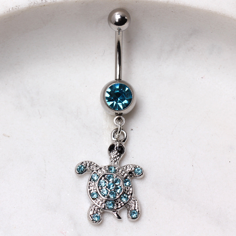 Dangling Turtle with Aqua Gem Belly Button Ring in with CZ Crystal Accents - 316L Stainless Steel