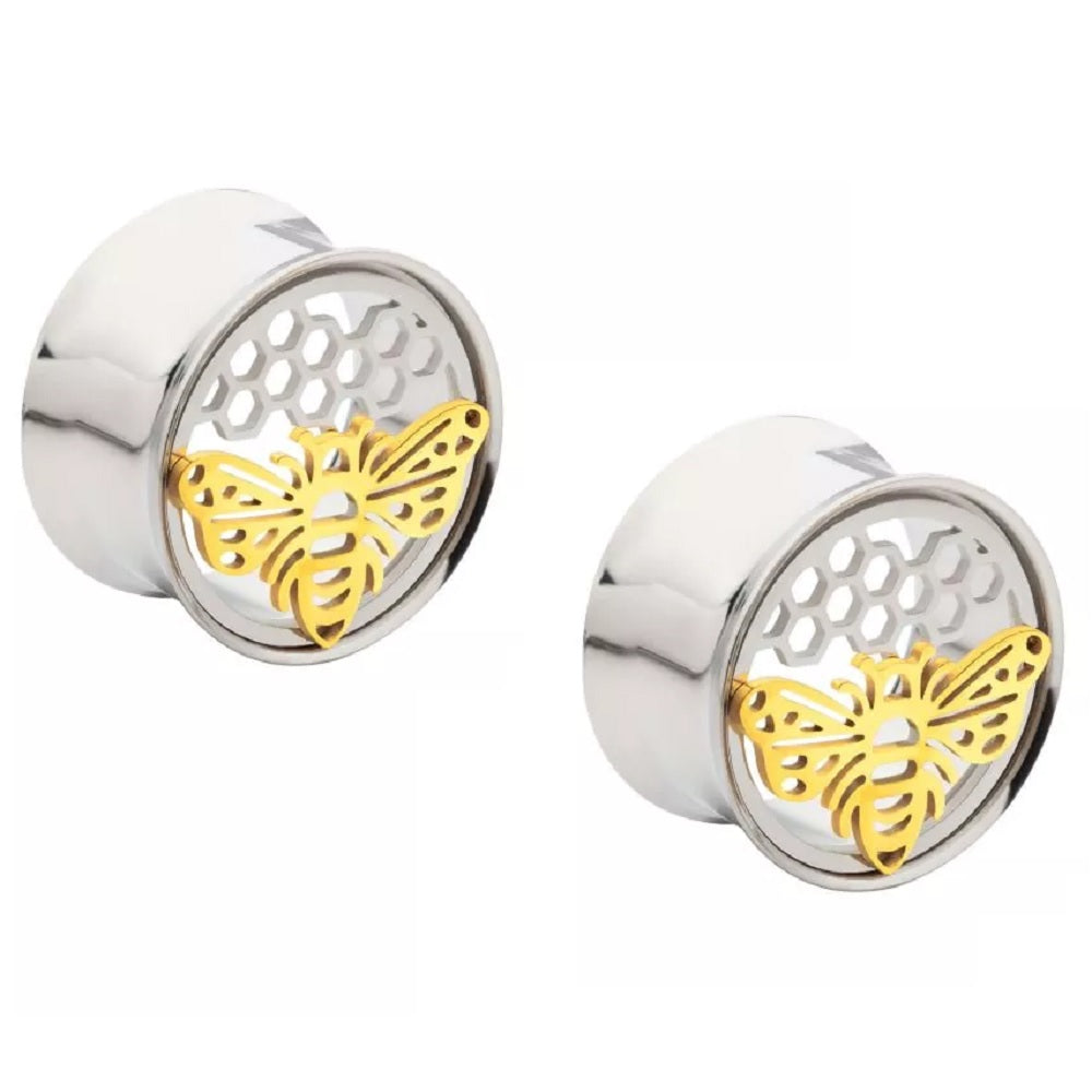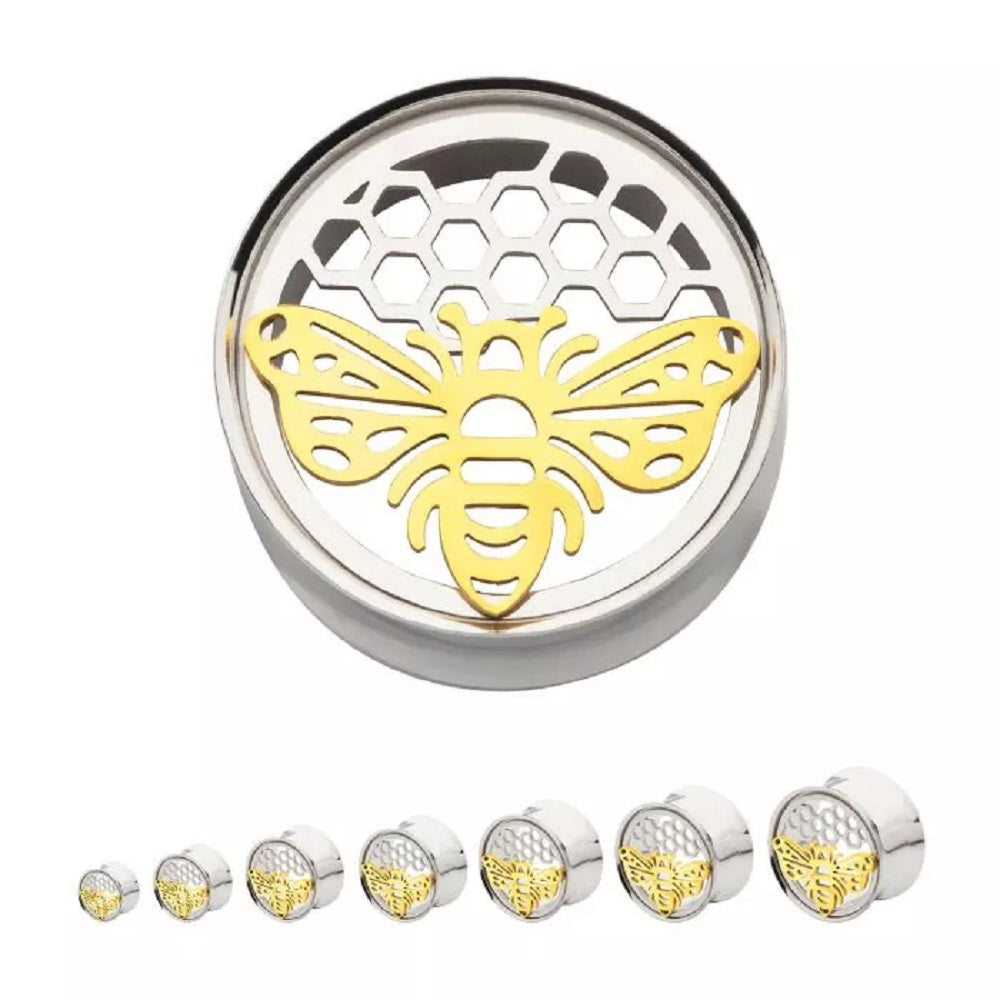 Gold PVD Cut Out Bee and Honeycomb Shape Double Flared Plugs - 316L Stainless Steel - Pair
