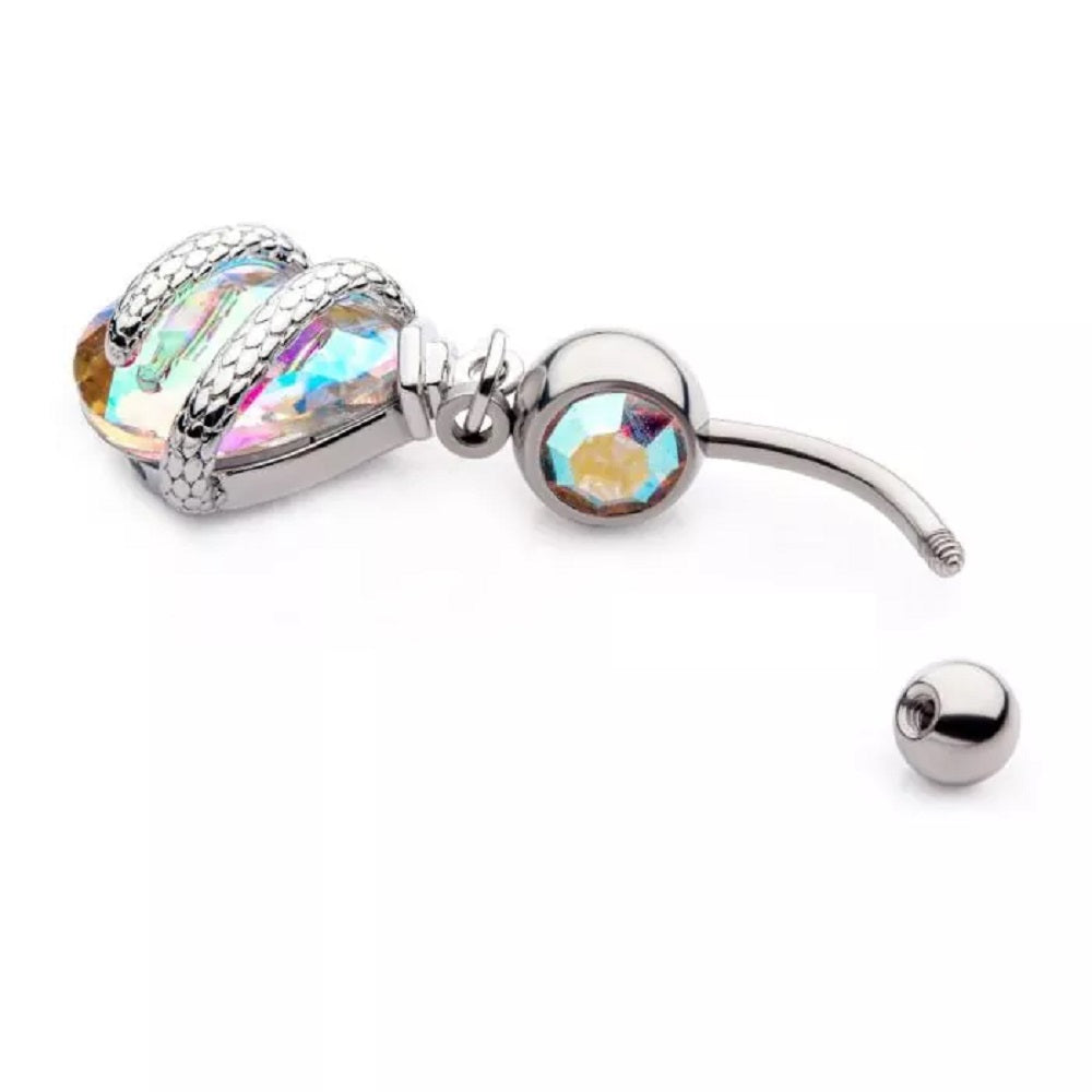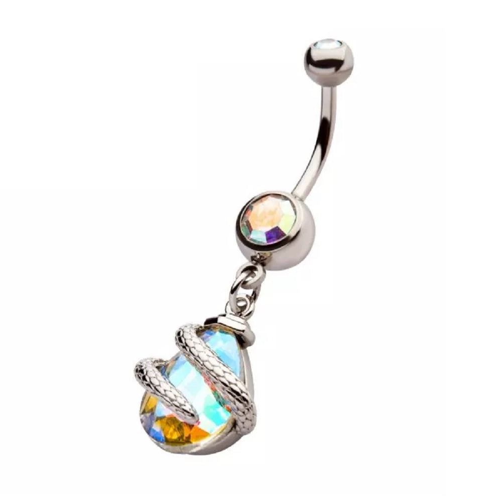 Snake Wrapped AB Teardrop Gem Dangle Belly Button Ring - 316L Stainless Steel