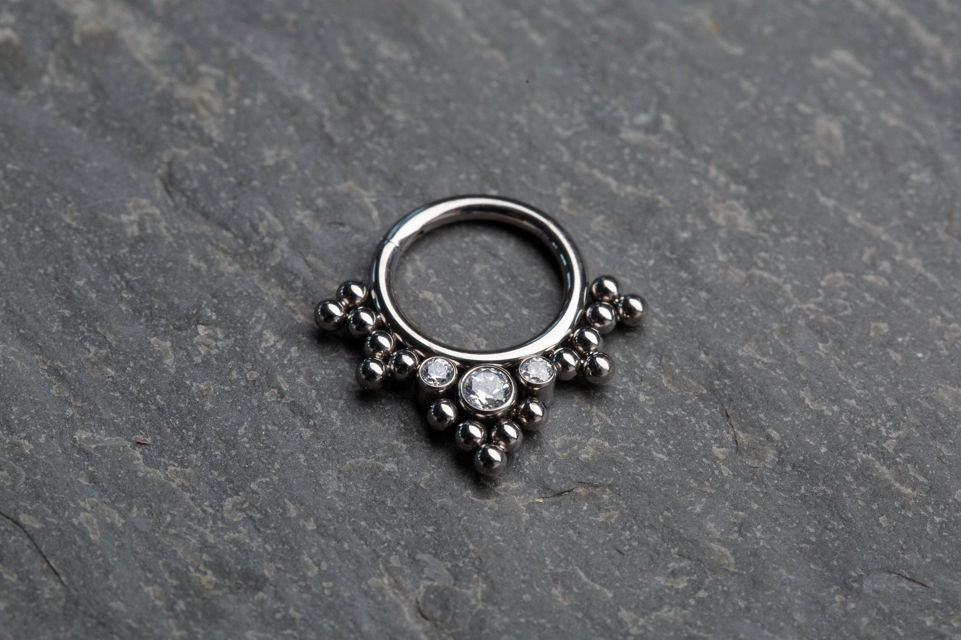 Triple CZ Crystal and Ball Cluster Lined Hoop Cartilage Helix Daith Septum Hinged Segment Ring